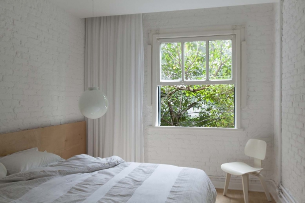 Na tomto bytě je rovněž pozoruhodné množství různých technik, které designéři použili k povrchovým úpravám stěn. Někde najdeme pouze strohé bílé stěny, v ložnici ale třeba cihlovou omítku natřenou nabílo. Ložnice tak neztrácí na jemnosti, ale zároveň působí nápaditě.