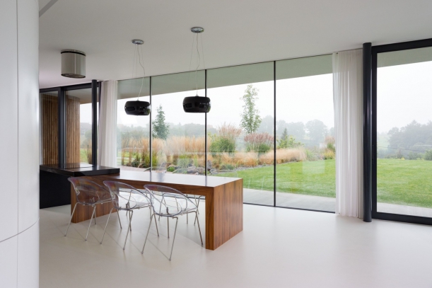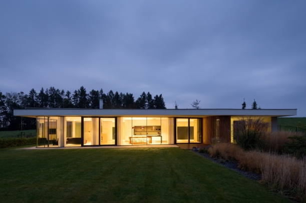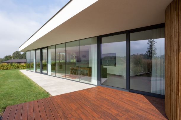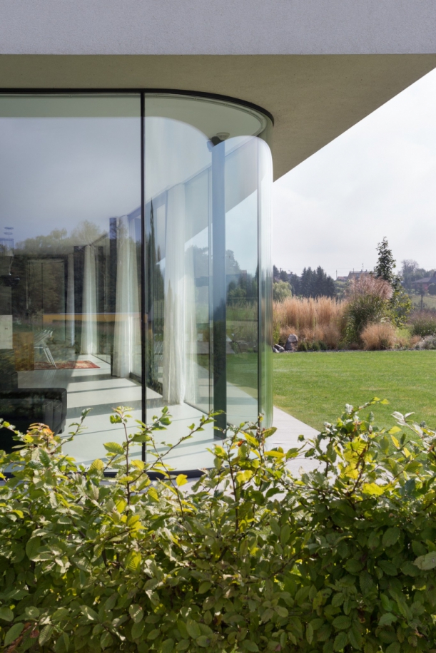 Jedinečnost domu tkví v převaze skla. Dům je totiž ze tří stran prosklený, a umožňuje tak dokonalé propojení s okolní přírodou. Architekti navíc zvolili kombinaci fixních a posuvných oken, čímž přispěli k lehké variabilitě a možnosti otevřít prostor v různých částech domu.
