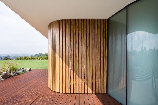 Už z venku každého jistě zaujmou oblé linie domu, které se ve větší míře opakují i uvnitř interiéru. Na dřevěnou terasu, kde majitelé v budoucnu plánují vytvořit bazén, vybíhá z vnitřku solitér sauny.