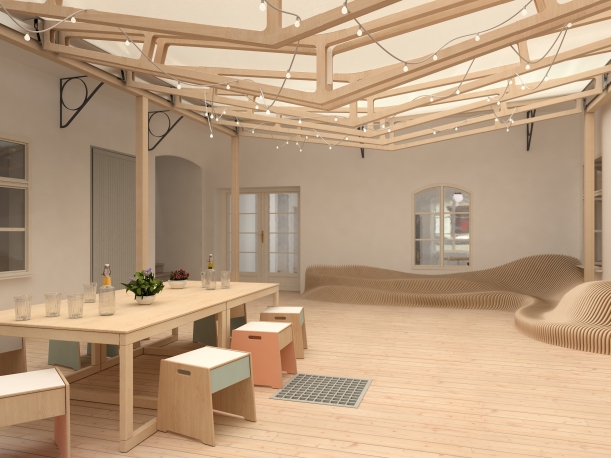 V okolí obchodního domu Kotva příjemné posezení nad dobrou kávou najdete jen těžko. Nedávno tu však vznikl nový podnik Atrium, jehož návrh vytvořili architekti Mikuláš Novotný a Vojtěch Fejlek. Autoři se potkali na UMPRUM v ateliéru, který vedlo berlínské studio Raumlabor. Od té doby pracují na společných zakázkách. Centrálním motivem kavárny, jak již sám název napovídá, je atrium, které slouží jako rušné náměstí spojující jednotlivé prostory. To však není zdaleka vše, co projekt nabízí.