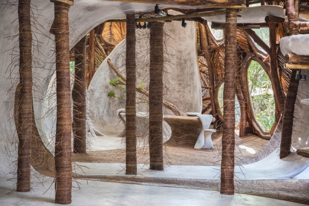 Oblé linie zakroucených podlah, dveří i různých cestiček jsou z leštěného cementu, doplněné surovými lijánami, které tvoří popínavá, pro tento region typická rostlina bejuco. Střídáním těchto materiálů se docílilo zajímavého kontrastu, kdy teplý tón střídá ten studený a spolu s průhledy do svěží zeleně, skrz kulatá okna různých tvarů, vzniká příjemná podívaná.