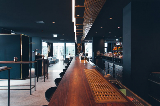 V baru panuje příjemná atmosféra. Architekti zvolili černý strop i stěny, čímž odkazují na původní přístup Le Corbusiera. Podařilo se jim vytvořit elegantní interiér, který navíc působí velice útulně a mosazné prvky mu dodávají opravdový šmrnc.