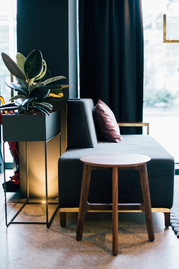 Švýcarští architekti zvolili moderní materiály, aby vytvořili designové prvky, které znovu interpretují vlastnosti historické budovy. Mosazné linie se spojují a prostupují různými kouty interiéru. V některých částech se rozšiřují a za barem se postupně proměňují ve stylové osvětlení.