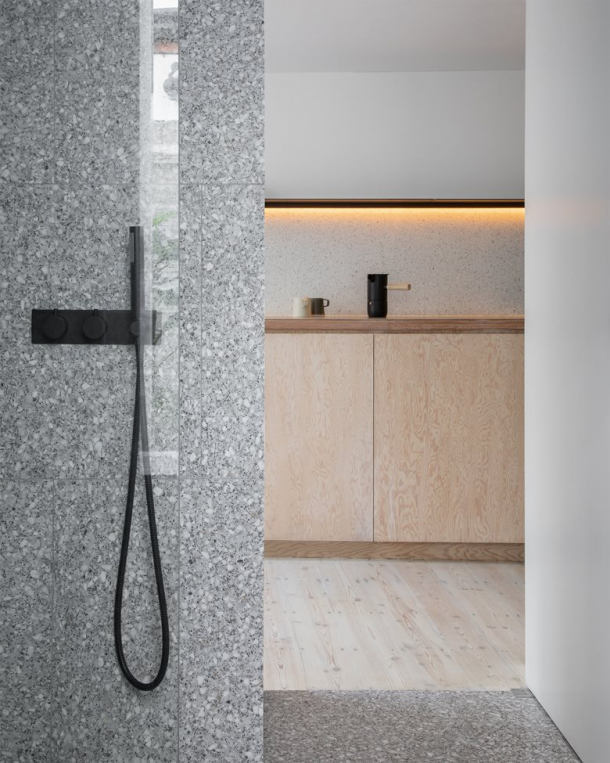 Kuchyň i koupelnu zdobí stylové terrazzo, které působí čistě a nadčasově.