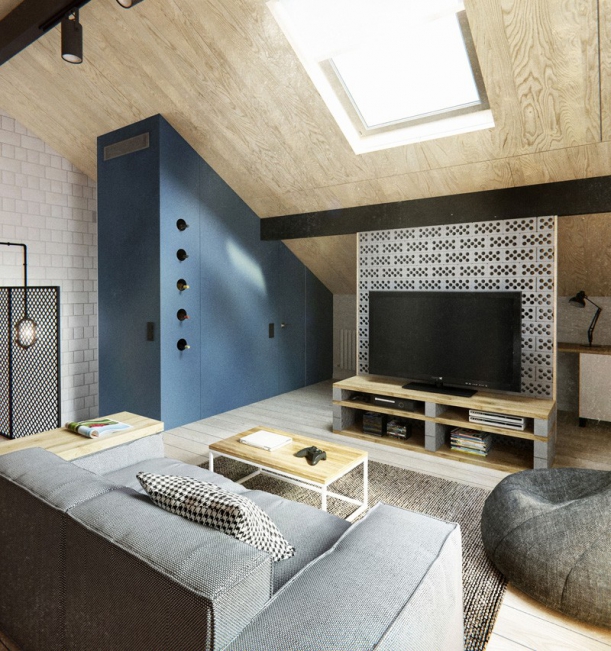 Podkroví je věnované odpočinkovému prostoru mediatéky s pracovnou, barem a šatnou. Opět se opakují světlé základní plochy hrubé bílé omítky a prkenných podlah, dokonce i kachličkový obklad zdi u baru je stejný jako v kuchyni v přízemí. Bar s pípou a kávovarem podpírají rudé barely, po kachličkovém obložení se plazí tovární lampy s po zdi taženými černými kabely. Příčka oddělující pracovní plochu a televizi je z neomítnutých perforovaných betonových dlaždic opatřně bezpečně rámovaných dřevěnými latěmi.