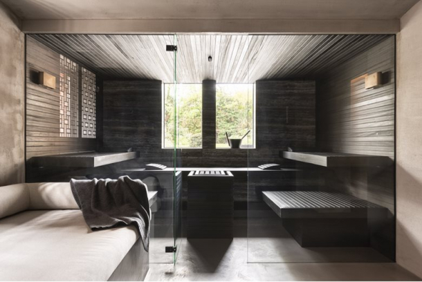 Suterén slouží jako wellness a fitness se saunou, koupelnou a prostorem k relaxaci. Nese se v surových texturách a teplých odstínech šedé. Dekorace jsou zastoupeny jen velice málo, autoři interiéru se nebojí nechat prostor volný bez zatížení zbytečných předmětů. Jen tak si doopravdy odpočine tělo i mysl.