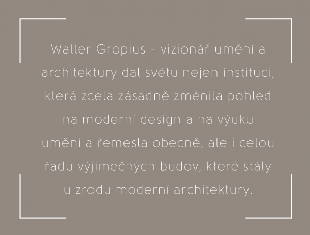 Letos oslavujeme sté výročí založení školy Bauhaus. A tak je jméno Walter Gropius často skloňováno. Tento vizionář umění a architektury dal světu nejen instituci, která zcela zásadně změnila pohled na moderní design a na výuku umění a řemesla obecně, ale také celou řadu výjimečných budov, které stály u zrodu moderní architektury. Do dějin se Walter Gropius zapsal především jako zakladatel legendární školy Bauhaus. O její historii jsme již psali začátkem roku. Dnes vám blíže představíme jejího zakladatele a také její hlavní budovu v Desavě, která patří k výjimečným stavbám z počátků moderní architektury.