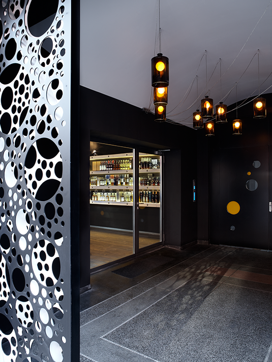 Exteriér i interiér doplňuje kruhový motiv, pro který mohla být inspirací kruhová dna láhví a sudů, nebo také bublinky prvotřídních šampaňských vín. Tento kruhový prvek je v kontrastu s přírodní a decentní kresbou dřeva.