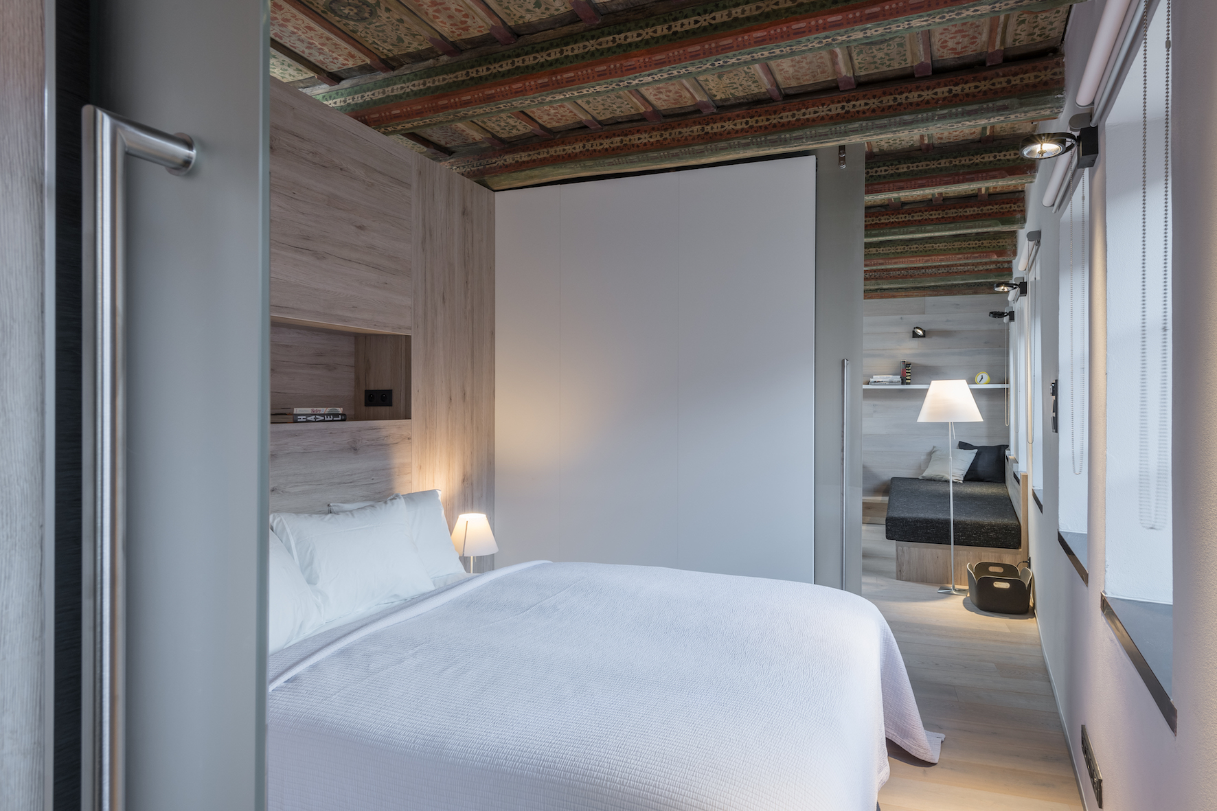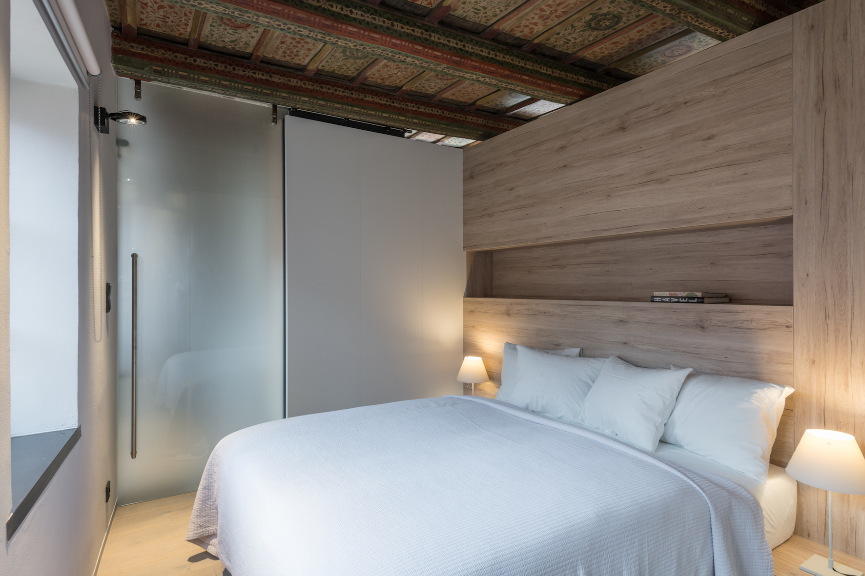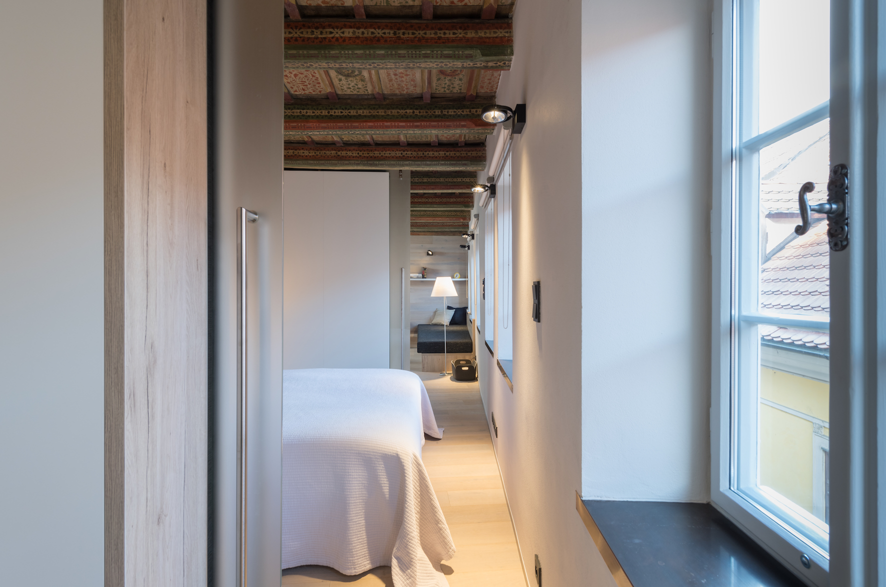 Výjimečnou hodnotou malého, ale velmi atraktivního bytu jsou renesanční malované trámové stropy. Procházejí nad celým prostorem, dokonce i nad balkonem do dvora. Aby se stropy mohly uplatnit v celé své kráse, z otevřené dispozice je pevně odděleno pouze hygienické zázemí. Stěny ložnice tvoří lehké demontovatelné příčky a úložný nábytek, je tedy možné kdykoliv prostor vrátit do původní podoby.