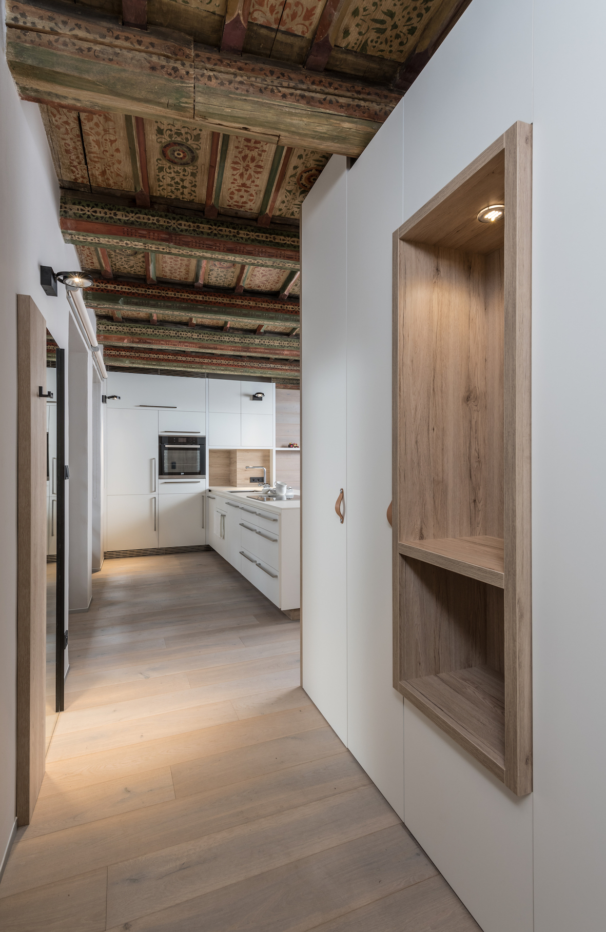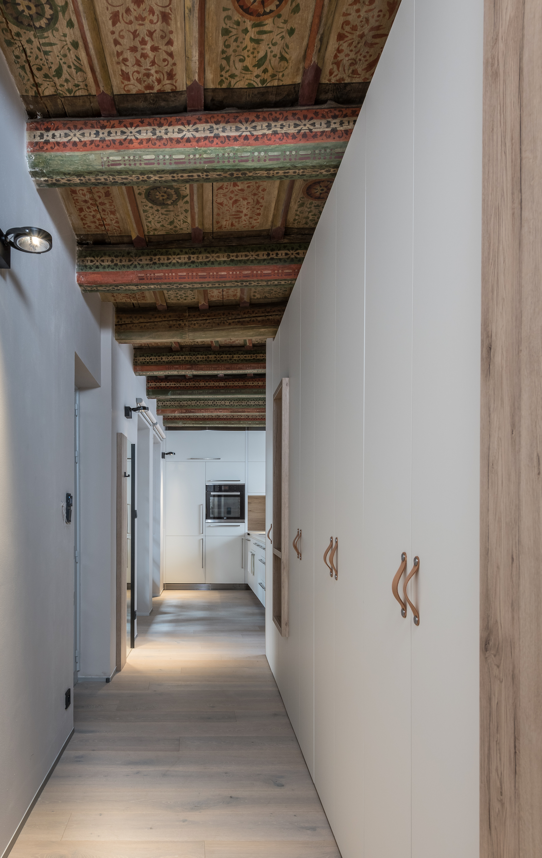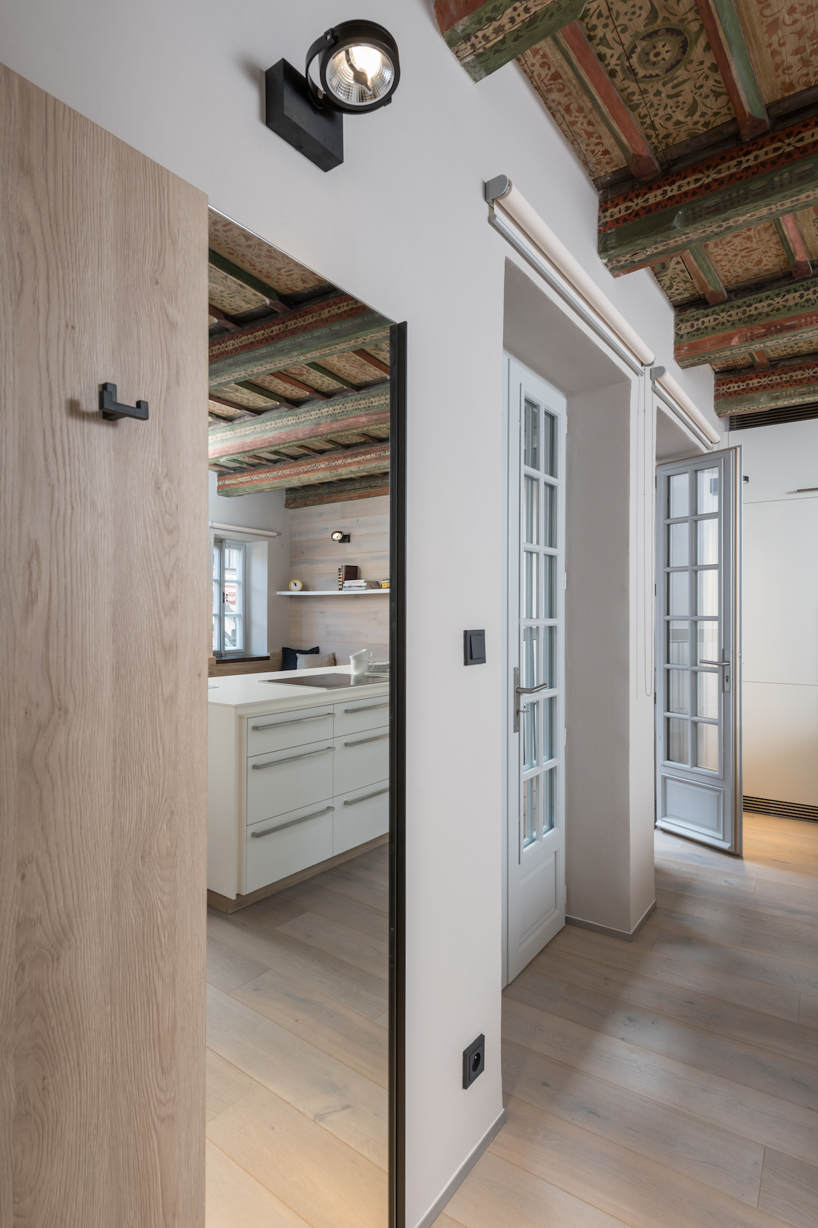 Výjimečnou hodnotou malého, ale velmi atraktivního bytu jsou renesanční malované trámové stropy. Procházejí nad celým prostorem, dokonce i nad balkonem do dvora. Aby se stropy mohly uplatnit v celé své kráse, z otevřené dispozice je pevně odděleno pouze hygienické zázemí. Stěny ložnice tvoří lehké demontovatelné příčky a úložný nábytek, je tedy možné kdykoliv prostor vrátit do původní podoby.