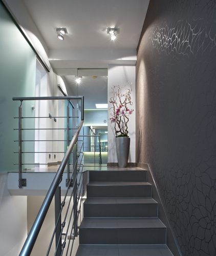 Interiér se vyznačuje výrazným koncepčním zpracováním, které je podtrženo zajímavou kombinací použitých materiálů a citlivě promyšleným výběrem solitérních kusů nábytku, osvětlení a dekorací. Realizace 4/2012. Rozloha: 190m².