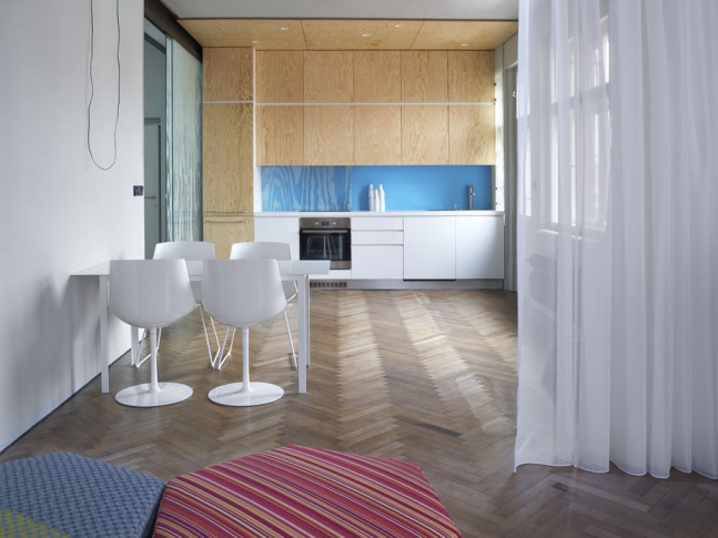 Kuchyň s jídelnou je od obytného prostoru oddělena jen lehkým závěsem a spoluvytváří tak velký prostor s několika funkcemi, typický pro současné bydlení.
