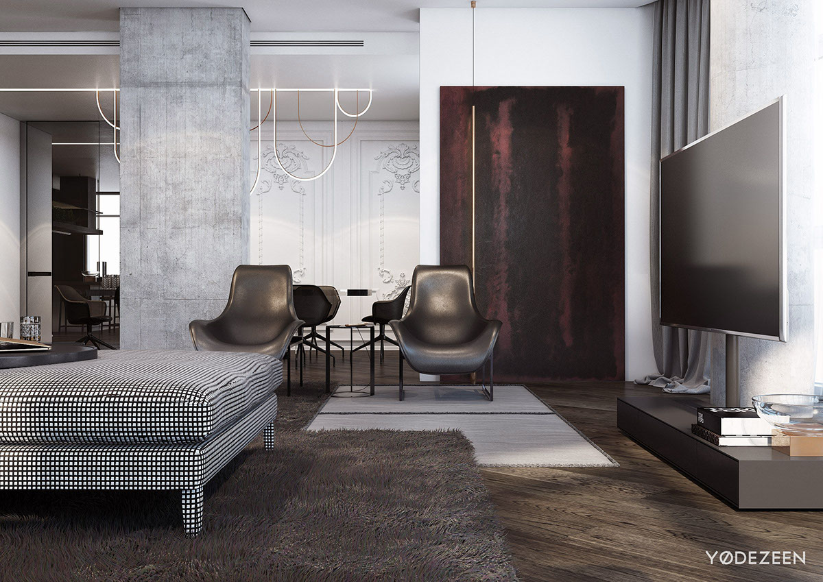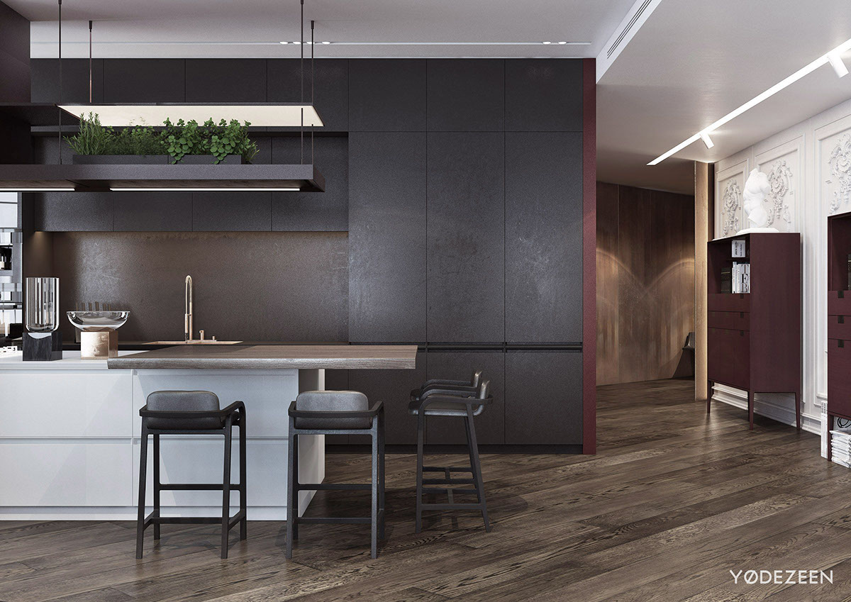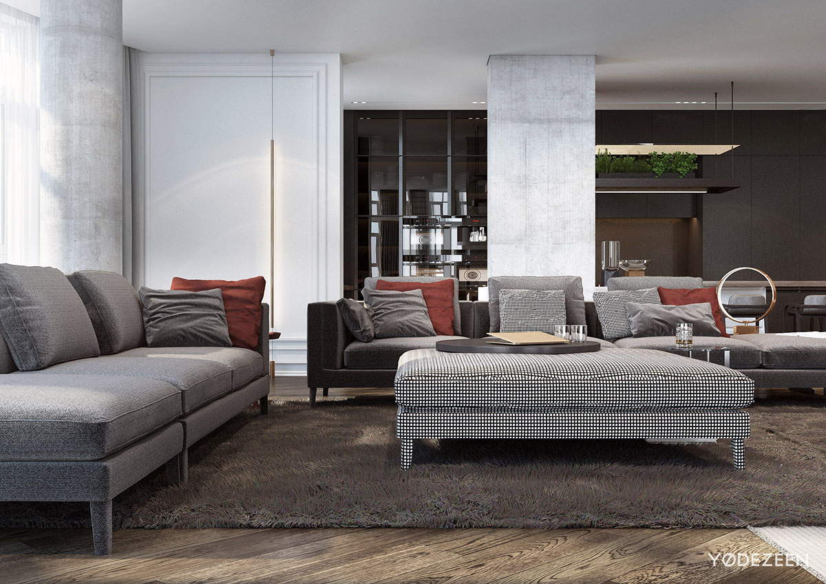 Tento neobyčejný byt kombinuje moderní prvky s klasickou a elegantní výzdobou. Dominují zde různé stupně šedé barvy, které jsou však doplněny o barevné akcenty a složité detaily, které celý být nevšedně oživují. Luxusní byt byl navržen studiem YØ DEZEEN pro mladou rodinu, která se nebude bát byt v průběhu let upravovat.