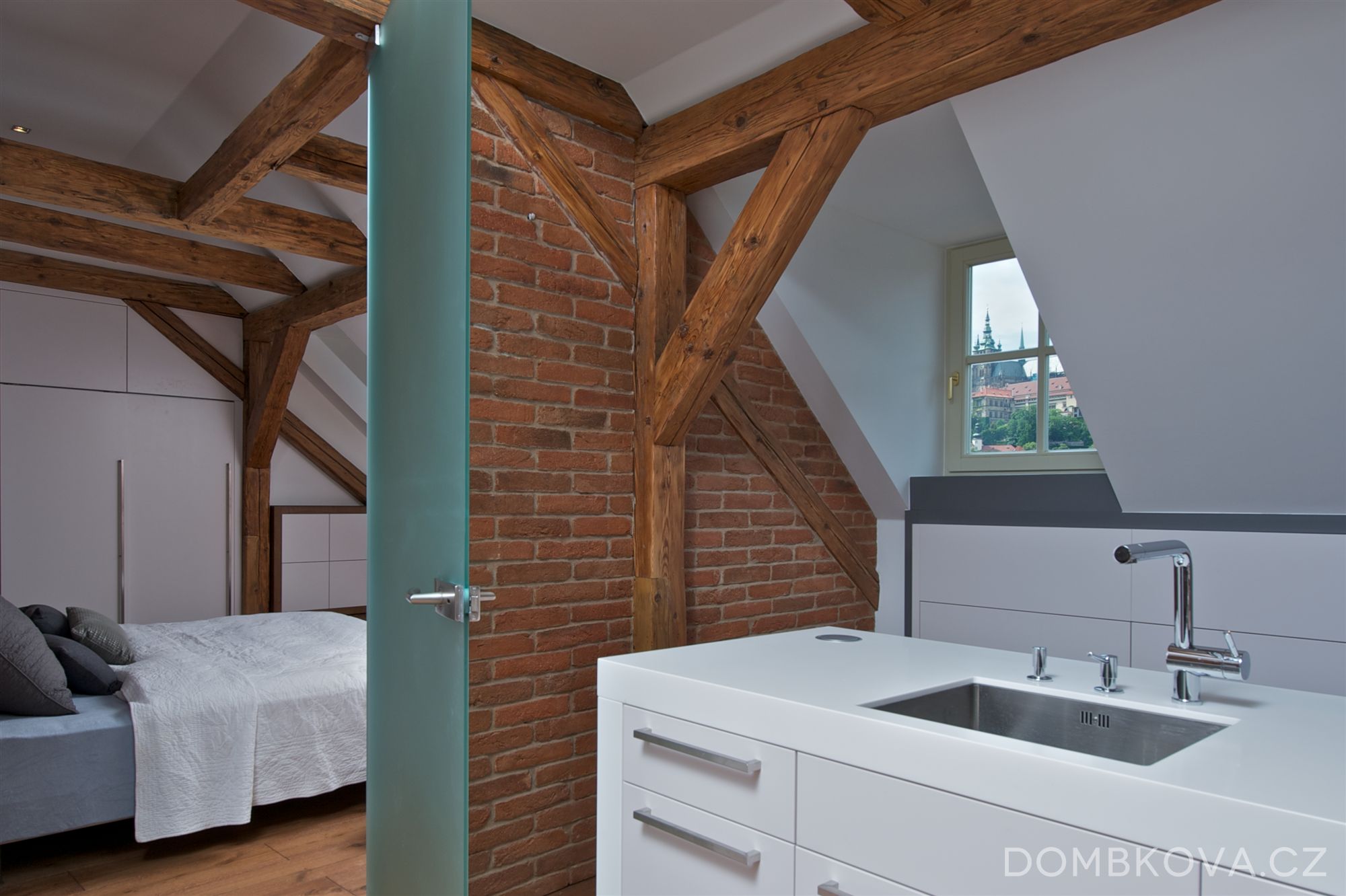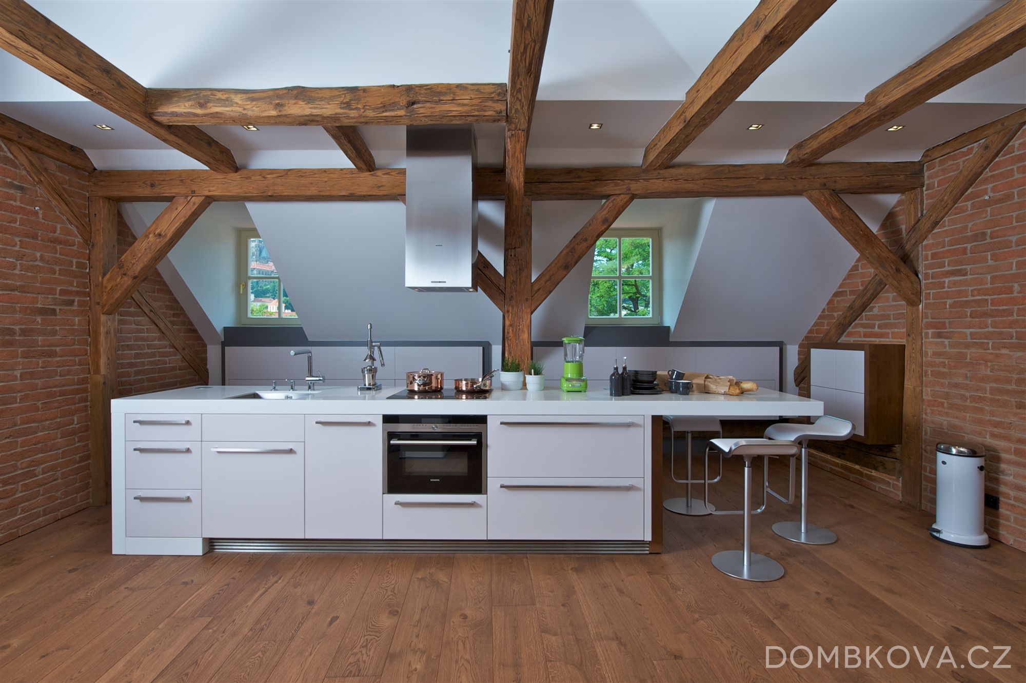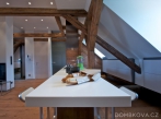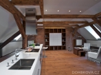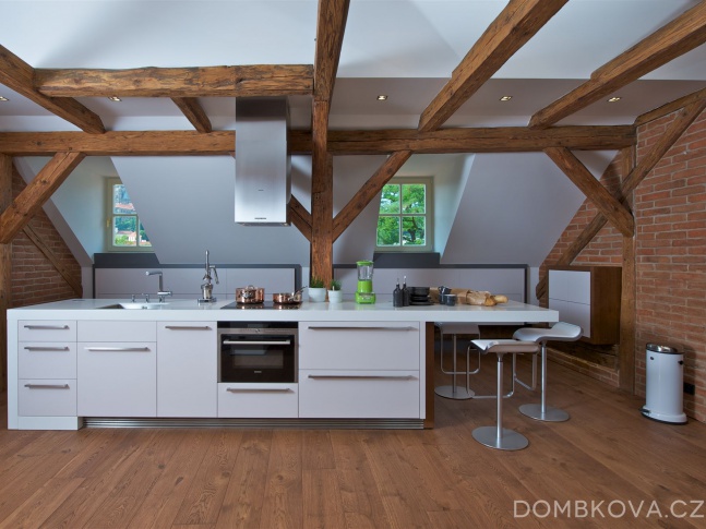 Dominantou prostoru je kuchyňský ostrůvek. V celém bytě jsou položeny masivní dubové podlahy, namořené do stejného odstínu, jaký mají trámy.