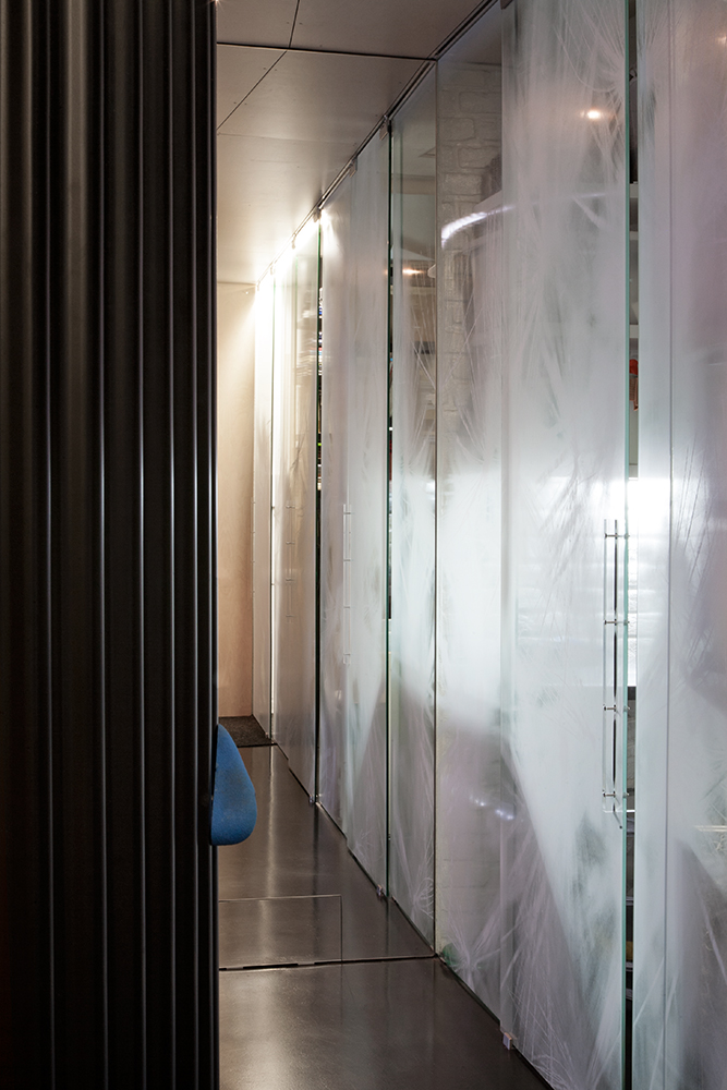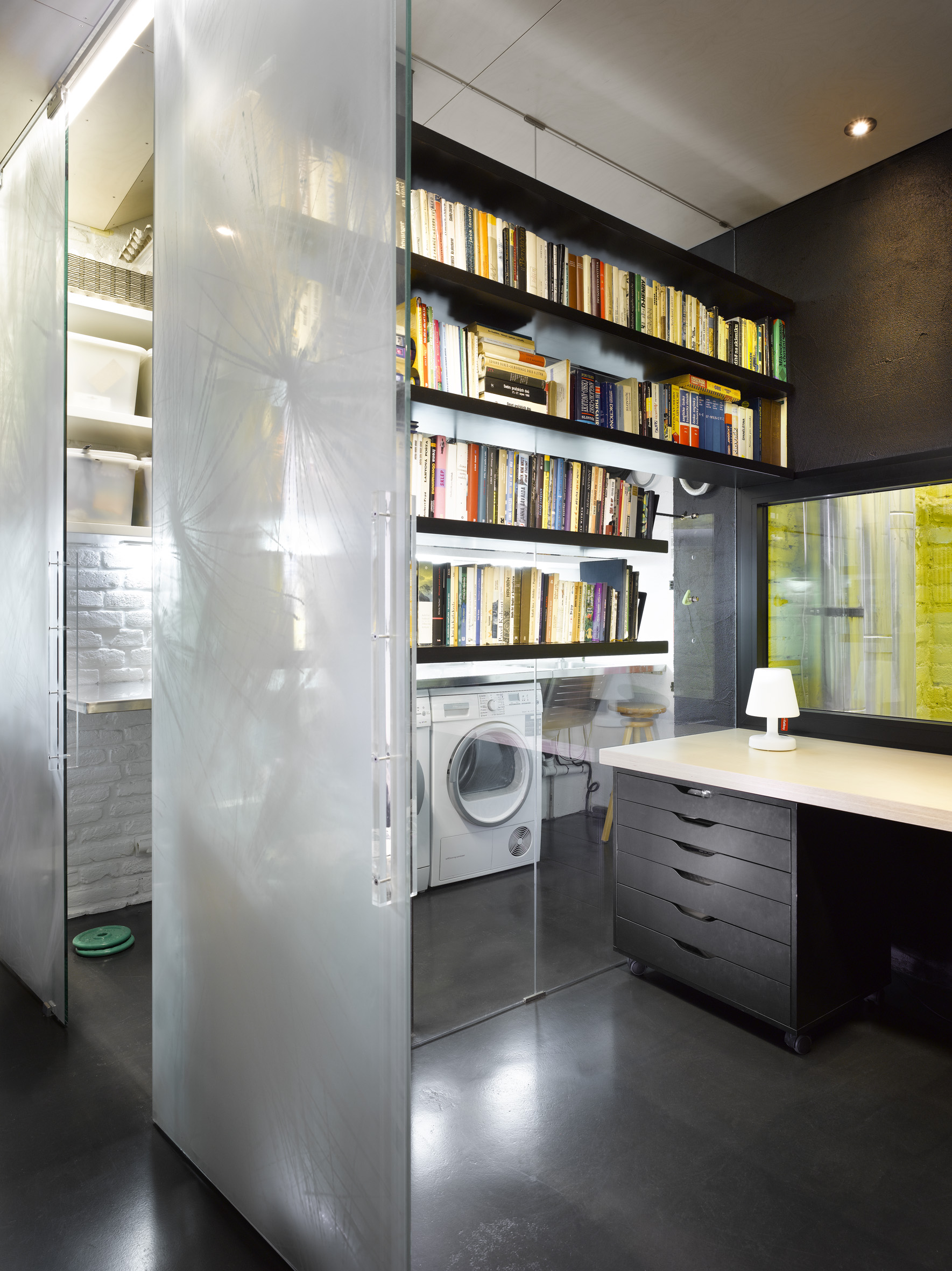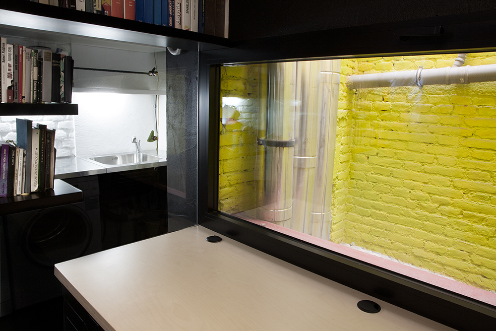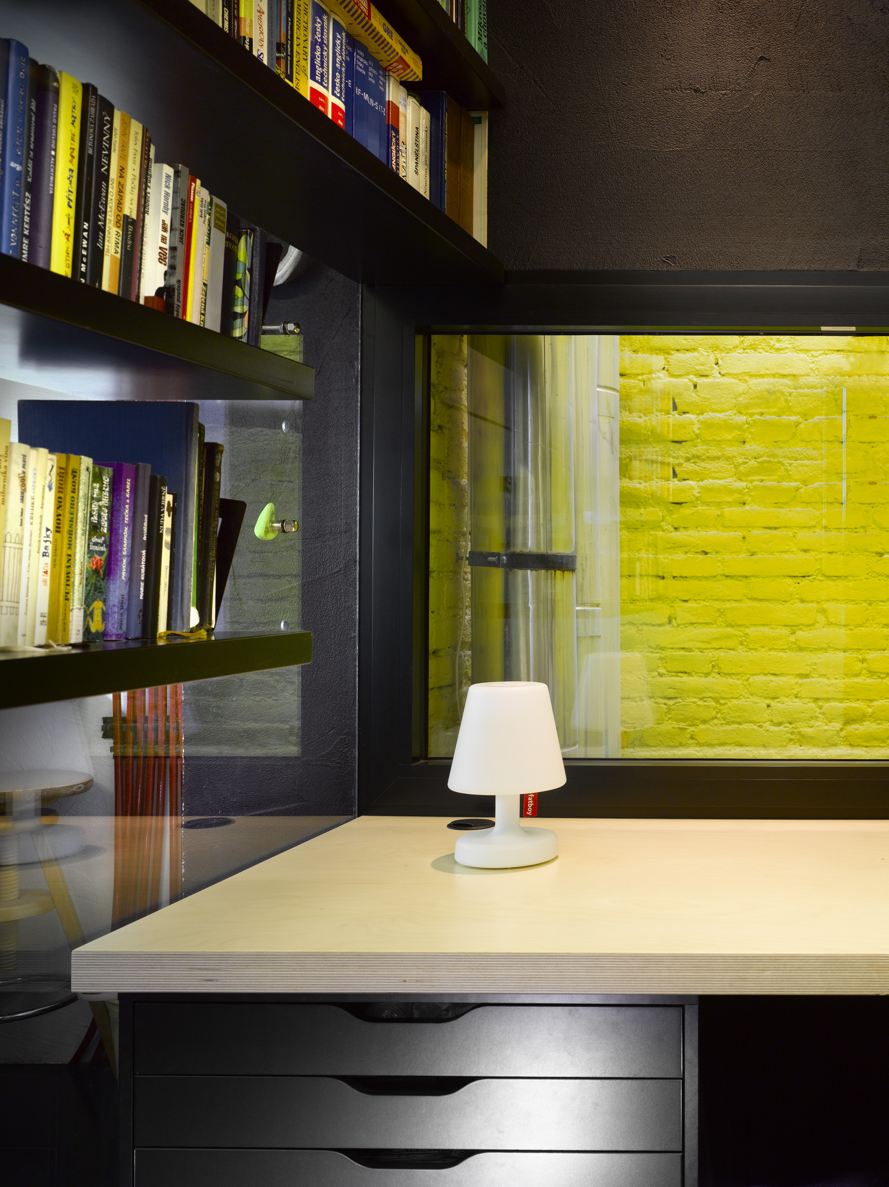 Místnost malé pracovny má výhled do klasického světlíku činžovního domu. Novým velkým oknem jsme do ní pustili světlo, které v kombinaci s jasným žlutým nátěrem starého cihlového zdiva evokuje sluneční svit.