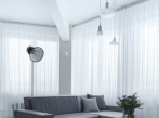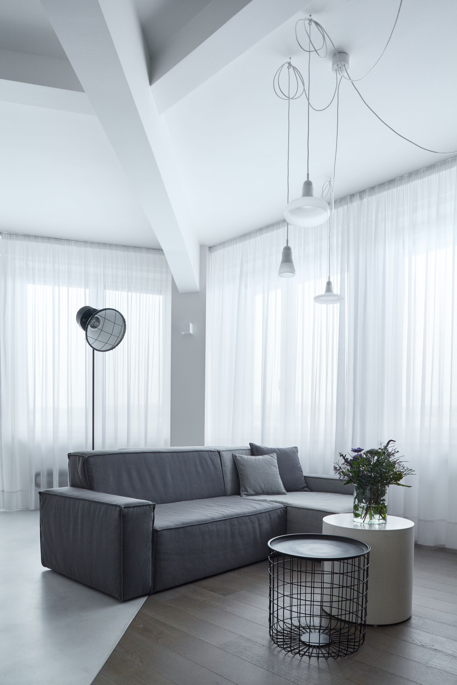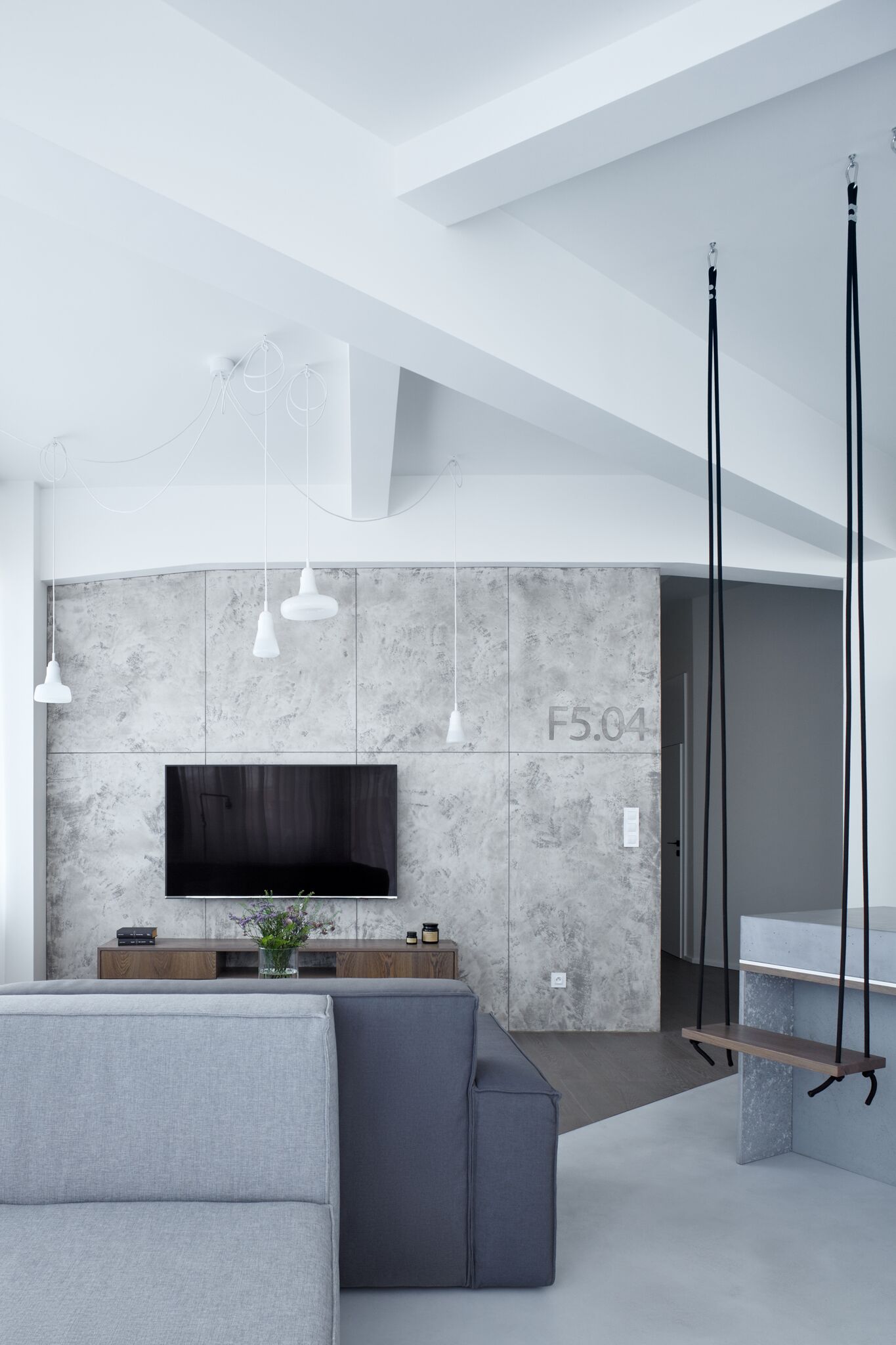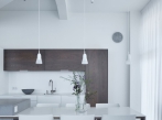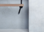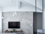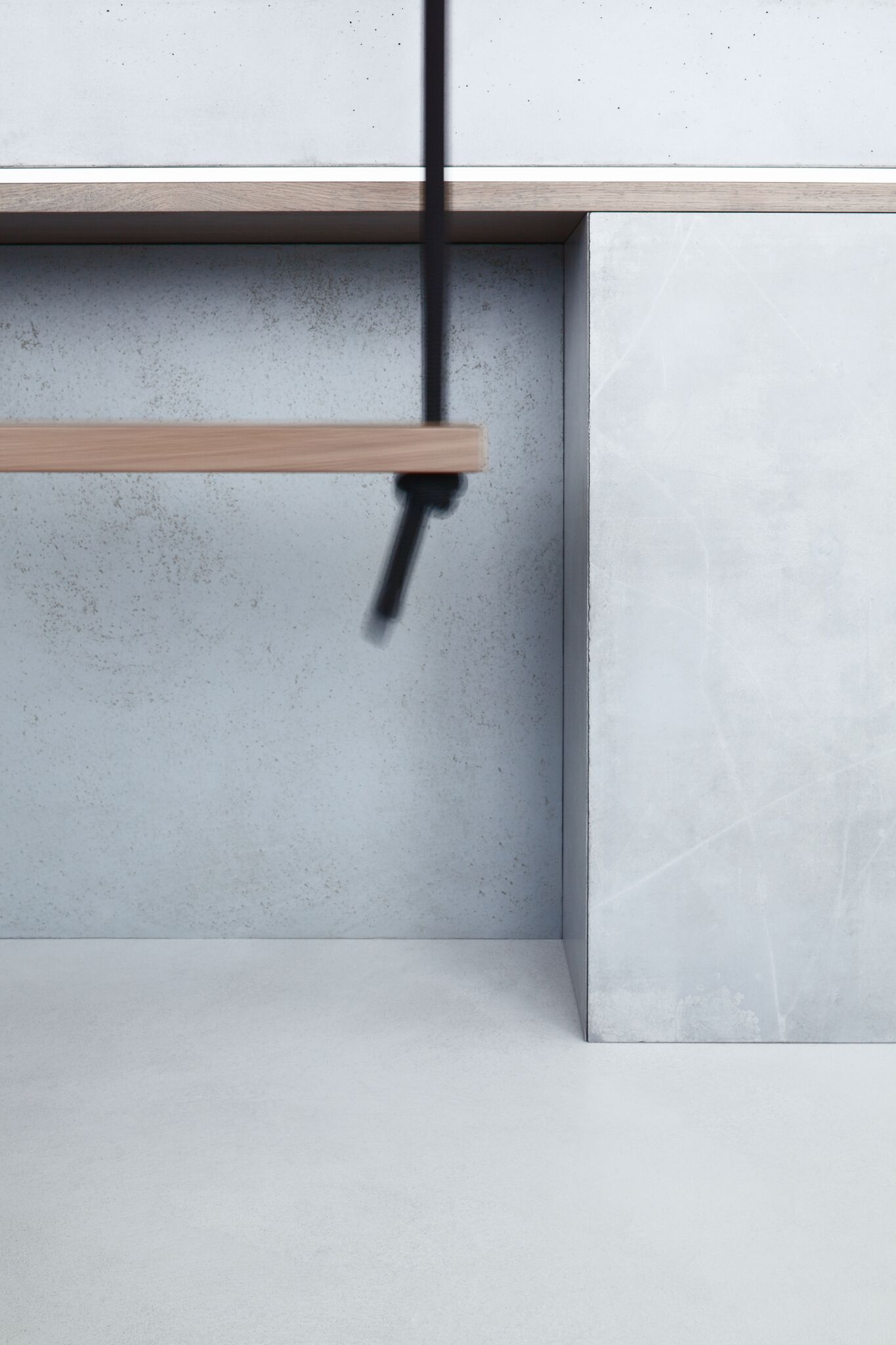 Kombinace dřeva a designové cementové stěrky Microtopping v kuchyni a obývacím pokoji.