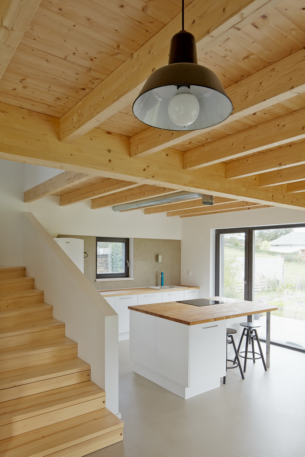 Dispozice domu na 10,5 x 7 m vyrostla na rovném a otevřeném pozemku v přímém kontaktu s okolní zástavbou. K jihu se otevírá jediný přímý výhled na přilehlý les. Dům se tak snaží obejmout vnitřní středové schodiště. Činí tak nejen aby rozčlenil vnitřní prostory, vytvořil zákoutí pracovny a kuchyně , ale aby je zároveň nechal propojené.