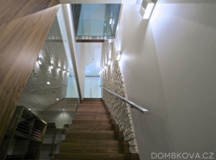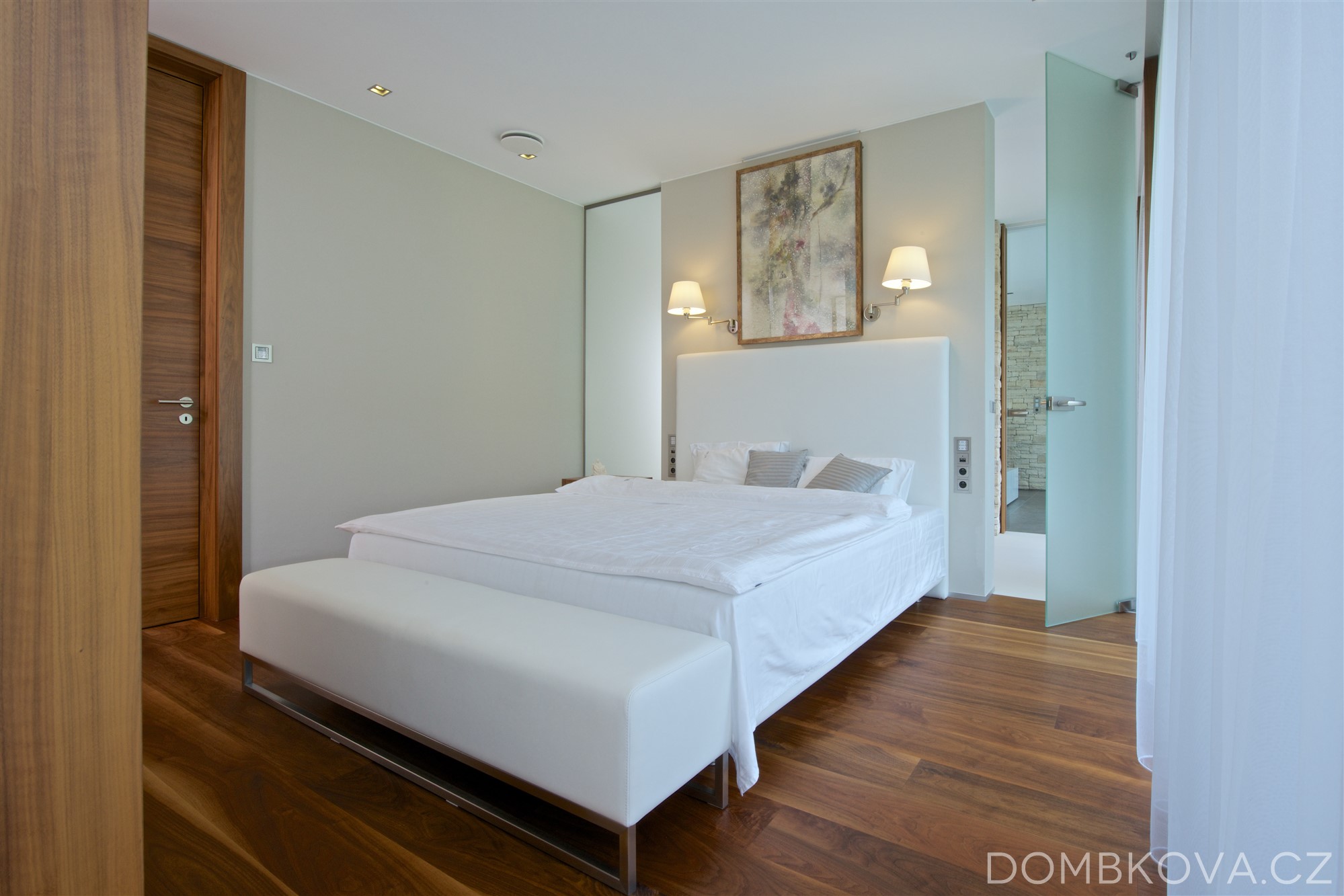 Druhé „rameno“ domu je klidové s ložnicemi, šatnami a koupelnami. Spojujícím momentem obou ramen je oboustranně prosklený prostor s vířivkou, z něhož je možno vstupovat do uzlu hlavní ložnice nebo přímo na terasu do zahrady.