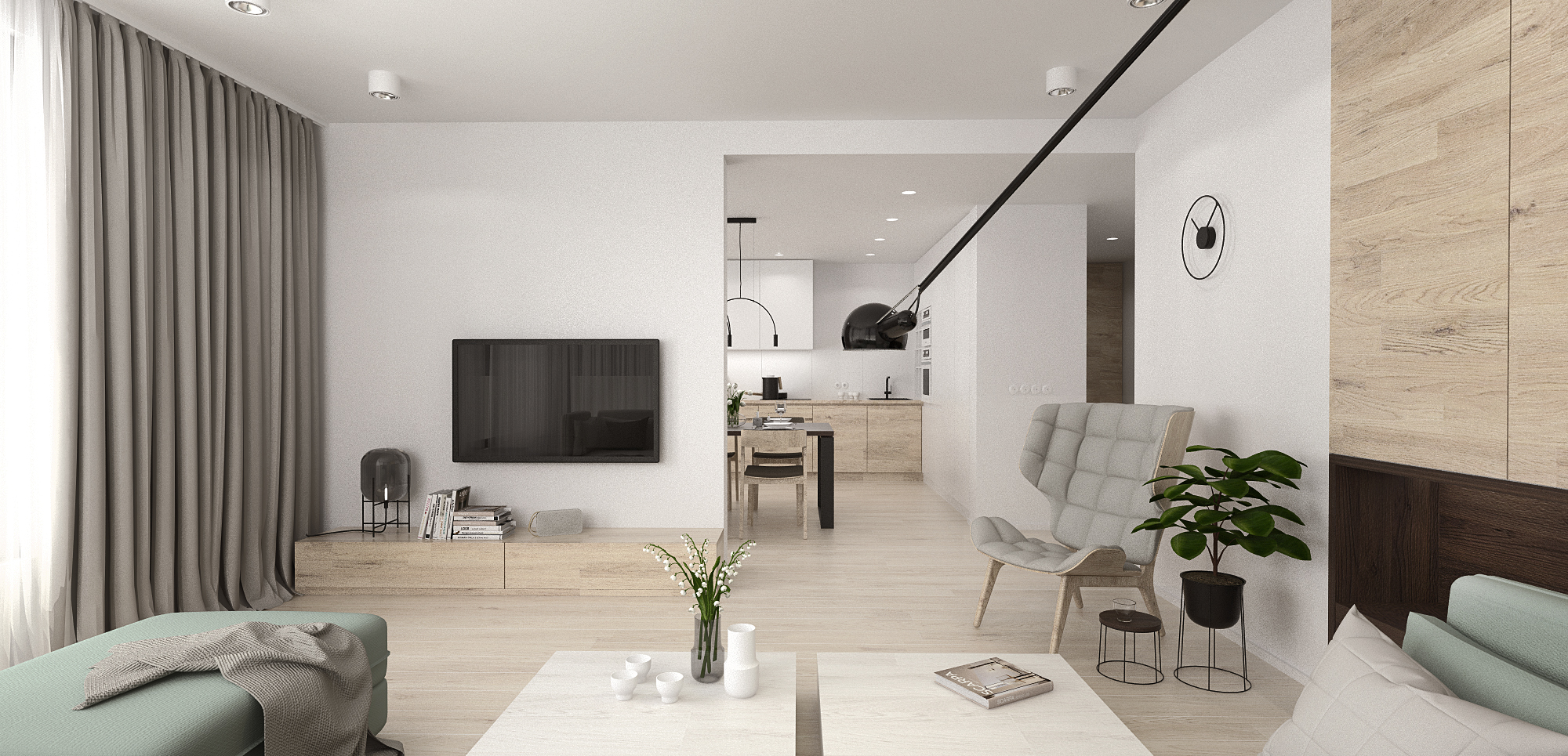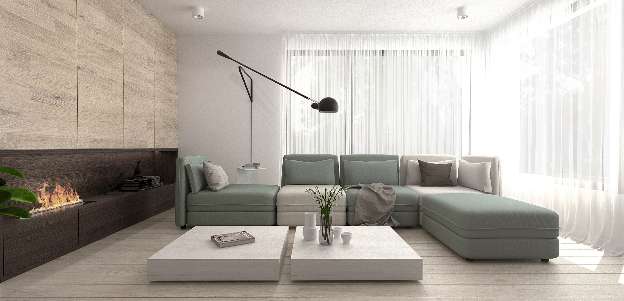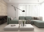 Hlavní místnost domu vyniká svou čistotou, necháváme vyniknout kvalitní přírodní materiály a kvalitní řemeslnou práci. Dominantou prostoru je členitá sedačka která v sobě ukrývá úložný prostor a hlavně rozkládací postel pro návštěvy. Interiér i přes minimalistické estetice působí útulně a domácky.