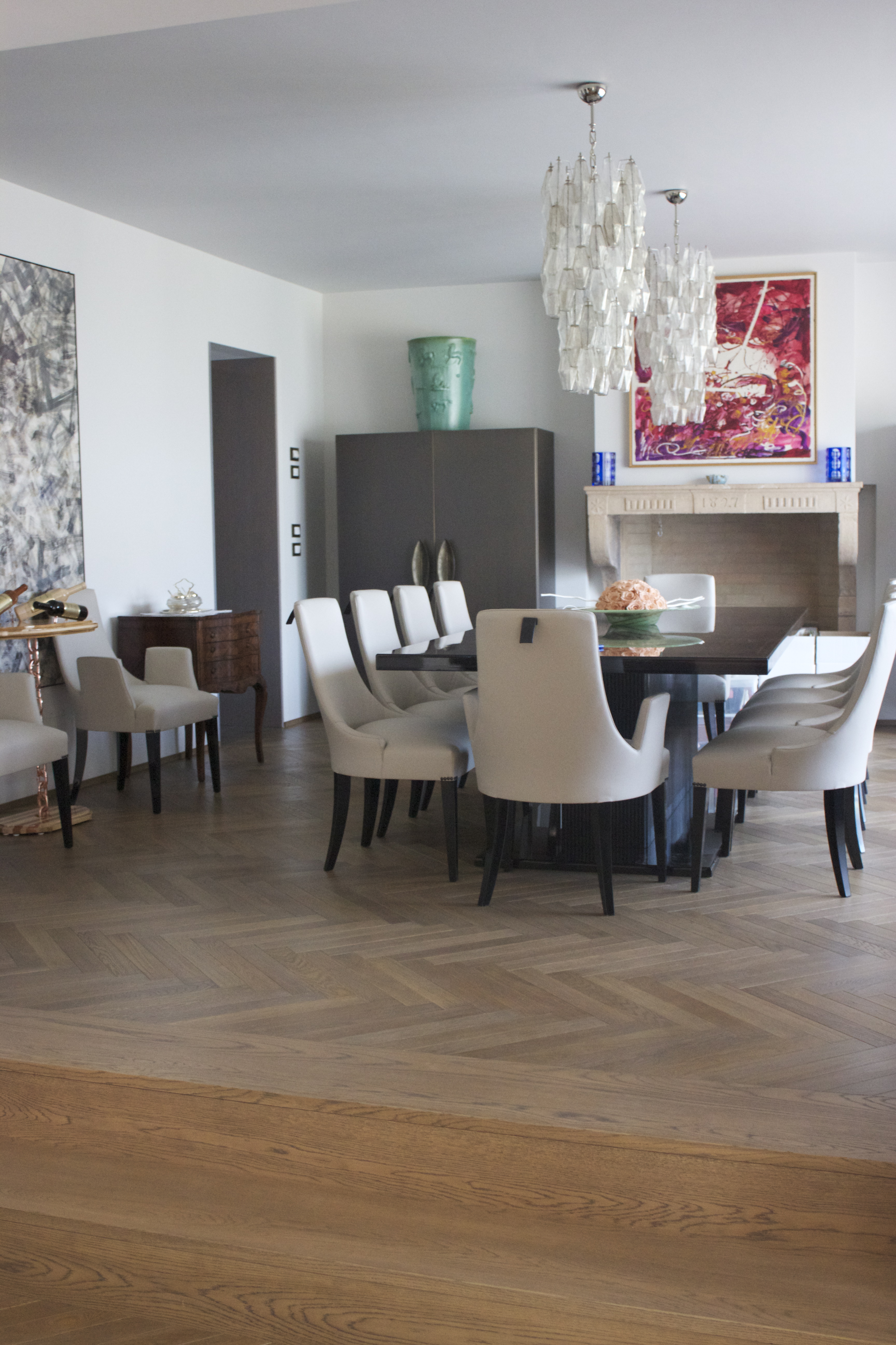 Jídelna Villa degli Ulivi s krbem a úchvatnými parketami italského výrobce Bassano Parquet.