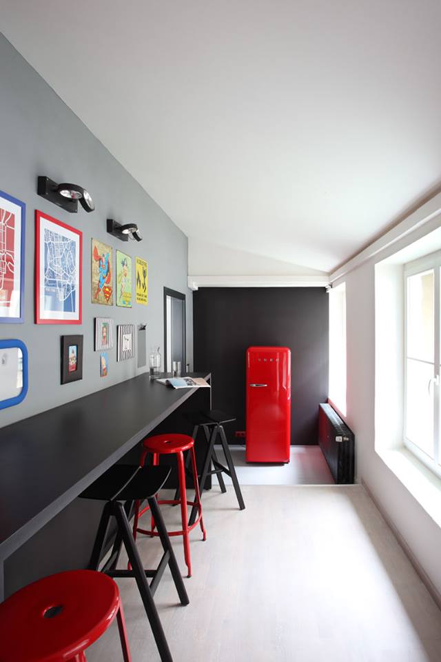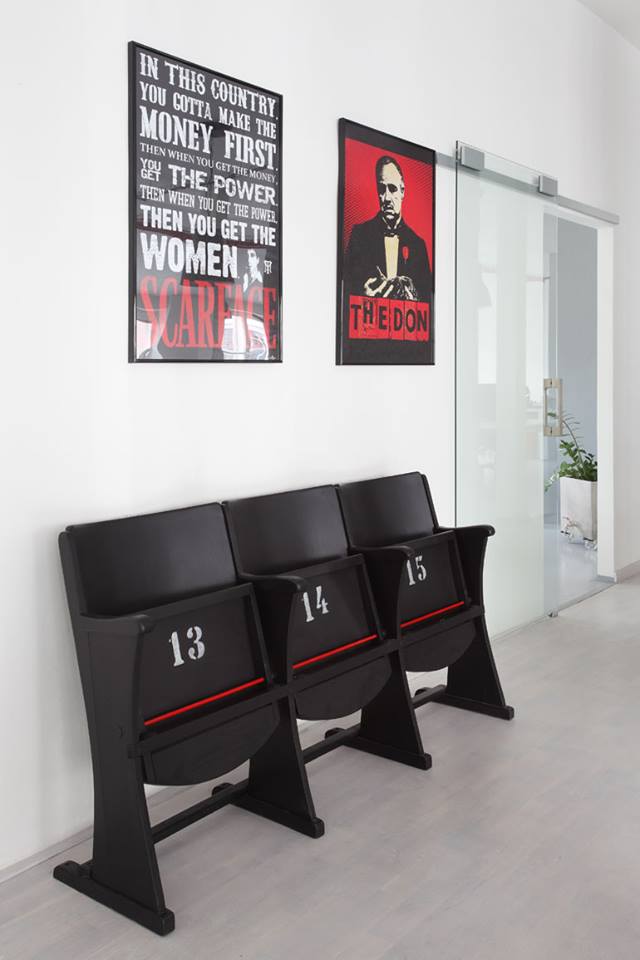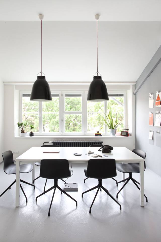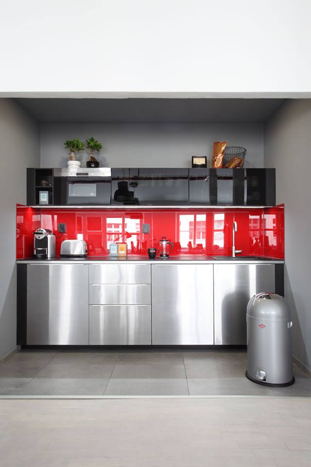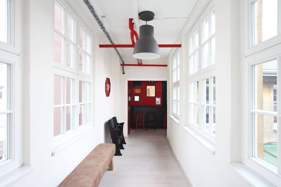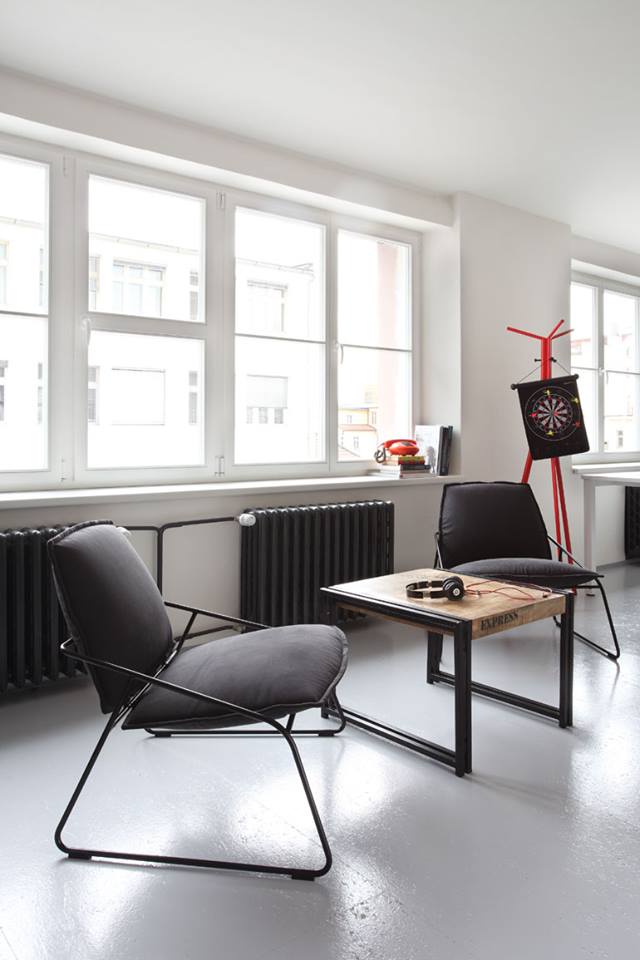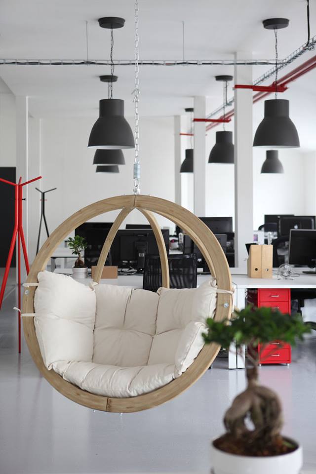 Hlavní pracovní prostor kanceláří Kindred Group je zajímavý mimo jiné pro odhalenou a pečlivě natřenou vzduchotechniku, to vše v barvách ladících se zbytkem interiéru. Najdete tu nejen stoly a počítače, ale také relaxační zahradní houpačku. O něco dále objevíte kuchyň v ladícím barevném provedení. Nejen zde jsou na podlaze OSB desky v kombinaci s parketami.