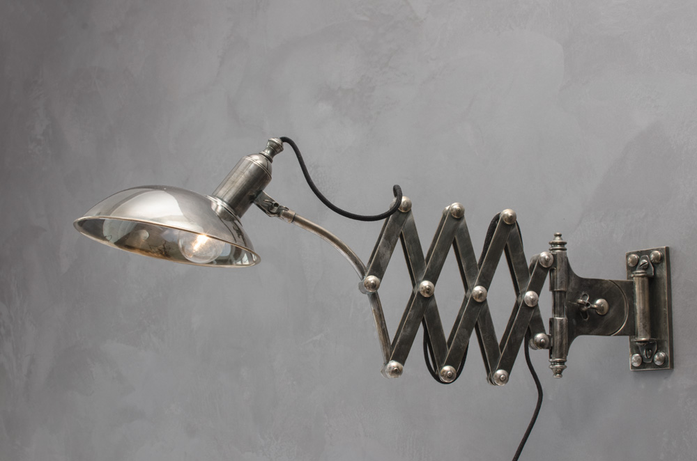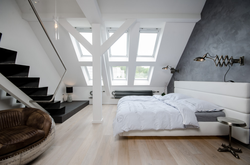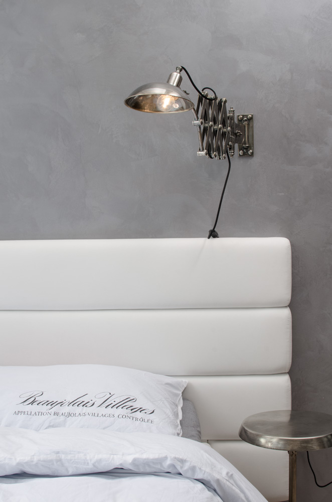 Ložnice s plovoucí podsvětlenou postelí a industriálními světly na teleskopické noze.