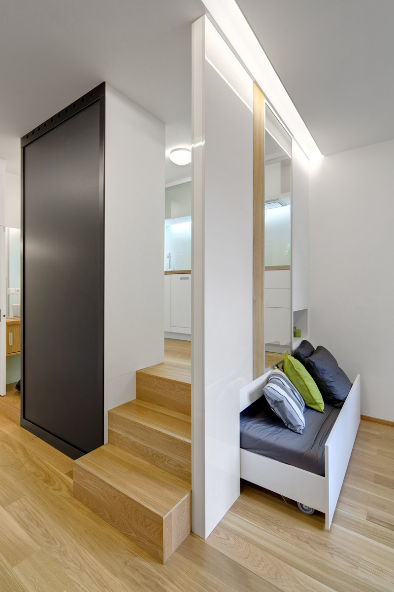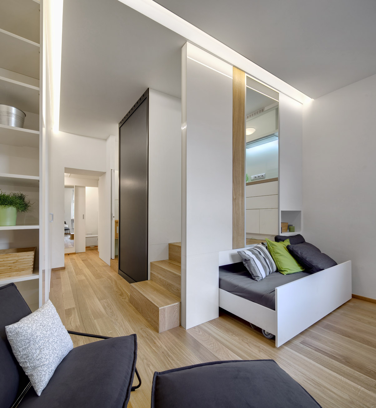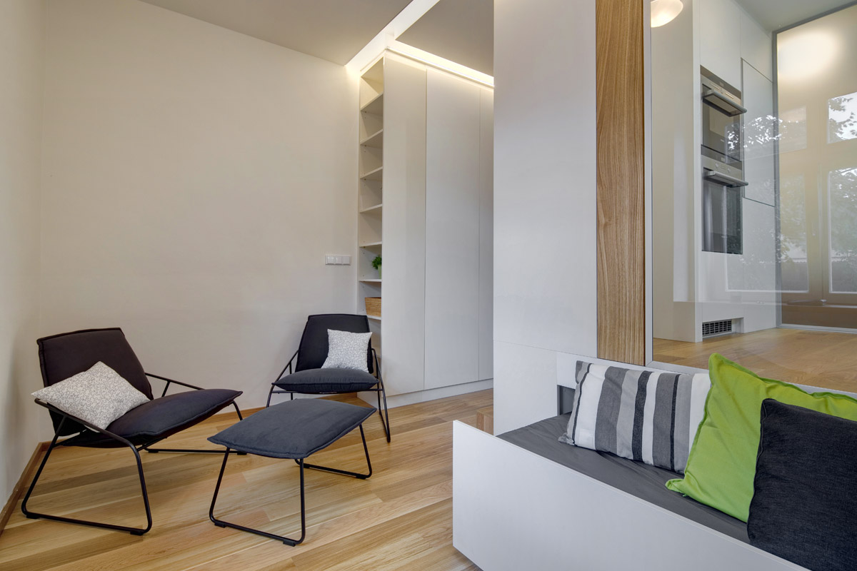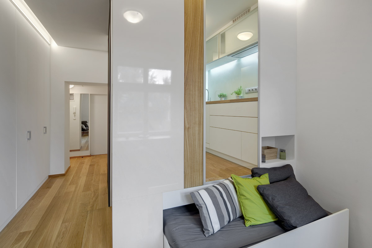 V případě požadavku klientky na plnohodnotné bydlení bez kompromisů, bylo nutné vytvořit neotřelý koncept s důrazem na řešení detailů, kdy jednotlivé prvky do sebe s maximální efektivitou zapadají. V jedné místnosti se tak odehrává kuchyně, ložnice, obývák s pracovním koutkem i šatna, to vše bez pocitu stísněnosti či bez „zakopávání“ o nábytek.