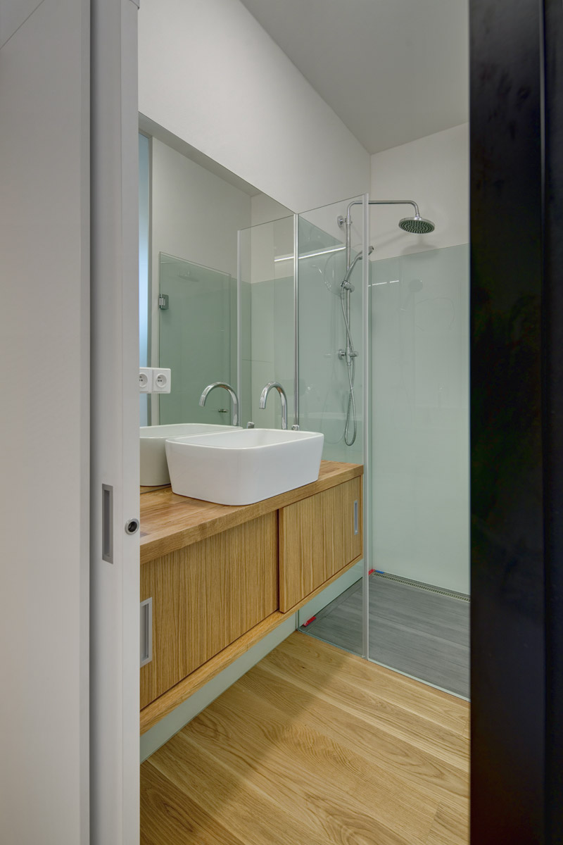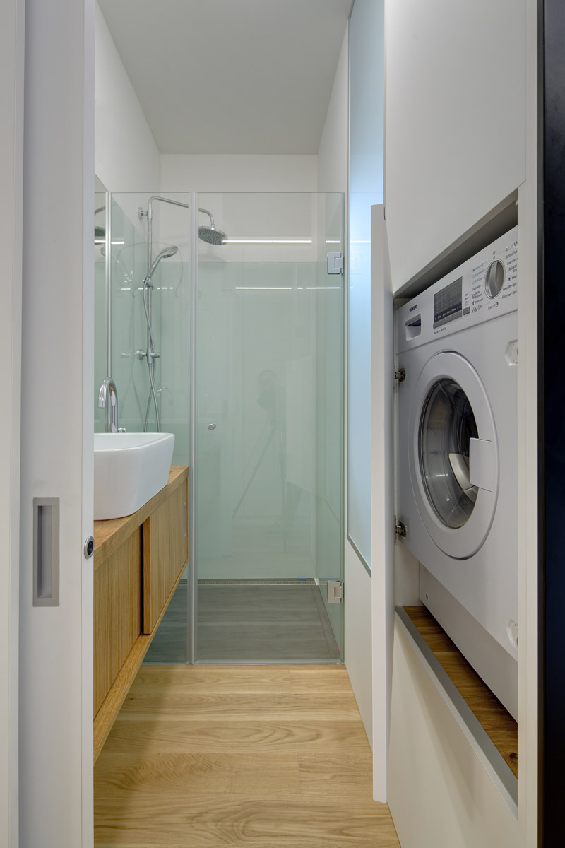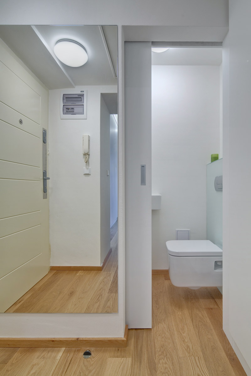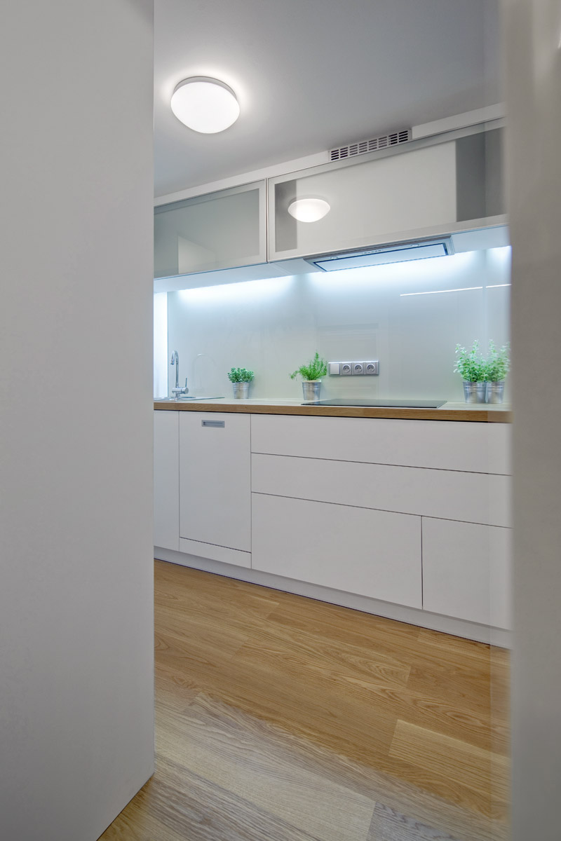 V případě požadavku klientky na plnohodnotné bydlení bez kompromisů, bylo nutné vytvořit neotřelý koncept s důrazem na řešení detailů, kdy jednotlivé prvky do sebe s maximální efektivitou zapadají. V jedné místnosti se tak odehrává kuchyně, ložnice, obývák s pracovním koutkem i šatna, to vše bez pocitu stísněnosti či bez „zakopávání“ o nábytek.