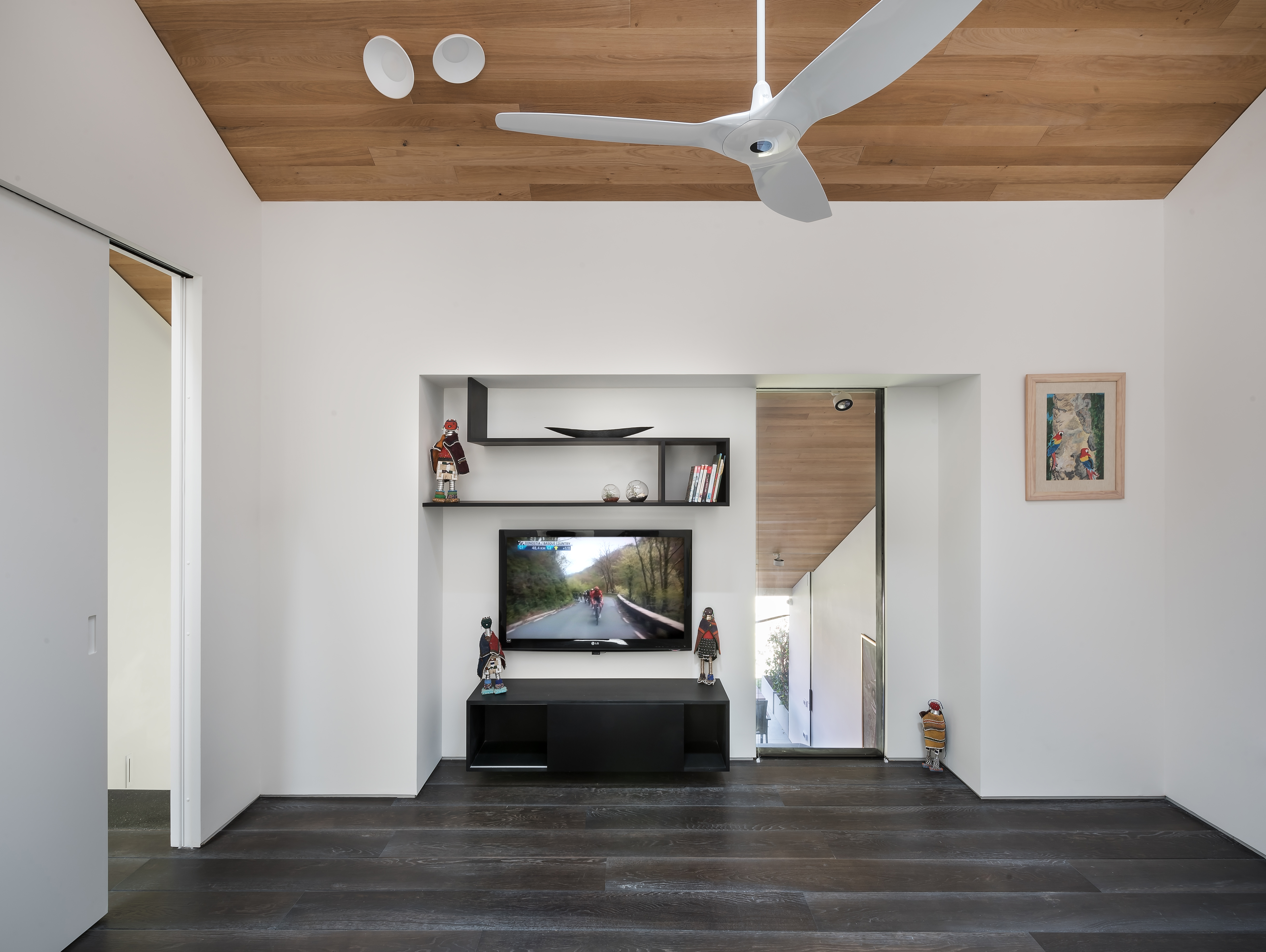 Obývací pokoj jako místo odpočinku. Místo kde s rodinou sledujete televizi. Místo, které je doplněno parketami italského výrobce Bassano Parquet.