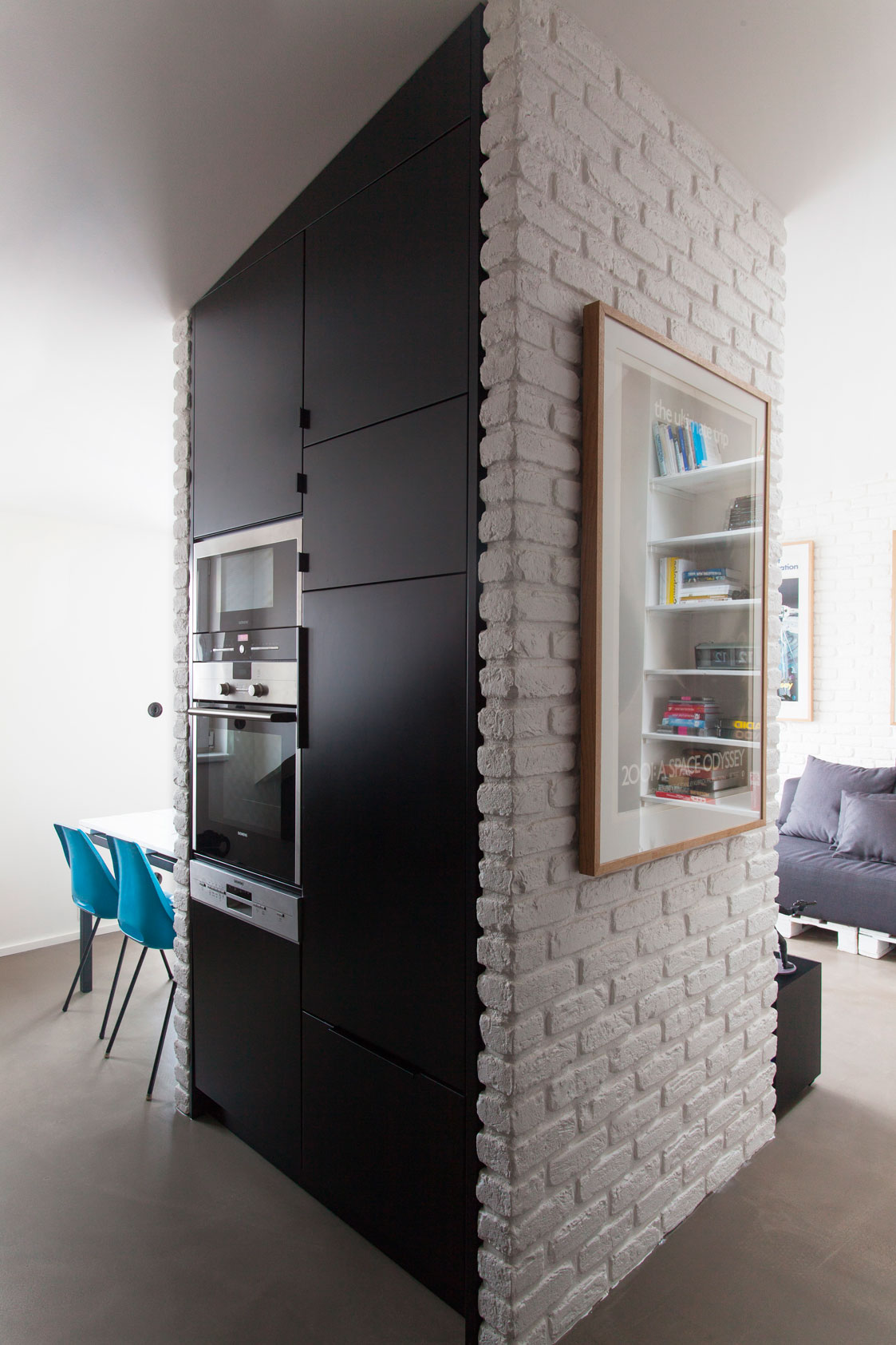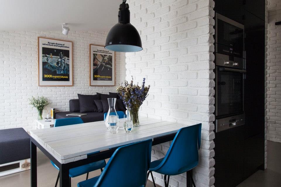 Půdní vestavbou prochází tři komínová tělesa, která určují dispozice tohoto bytu. Jídelní stůl spojuje protor obývacího pokoje a kuchyně. Stěny jsou bílé se zachovanou cihlovou strukturou. Nábytek včetně stolu je vyroben z europalet a je černobílý. Obývacímu prostoru barevně dominují modré jídelní židle. Podlaha je z litého betonu jednotná v celém bytě.