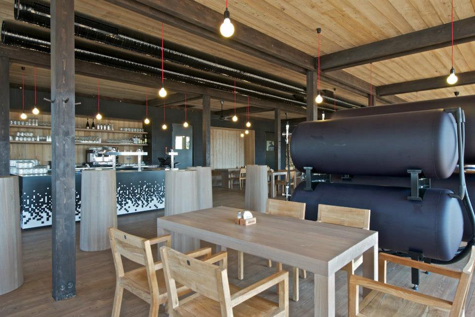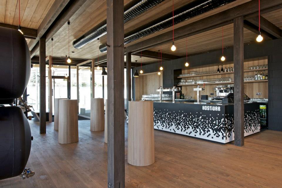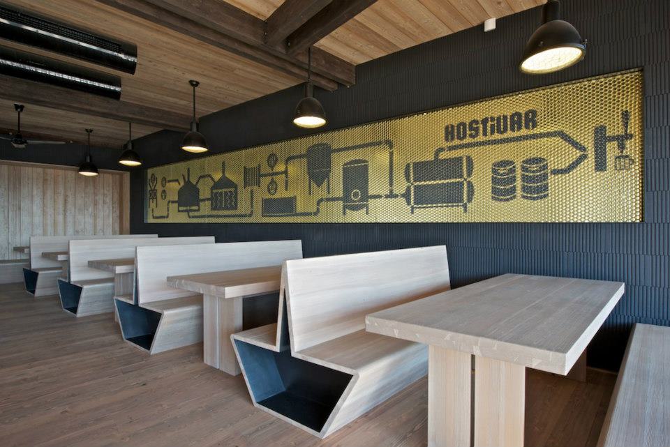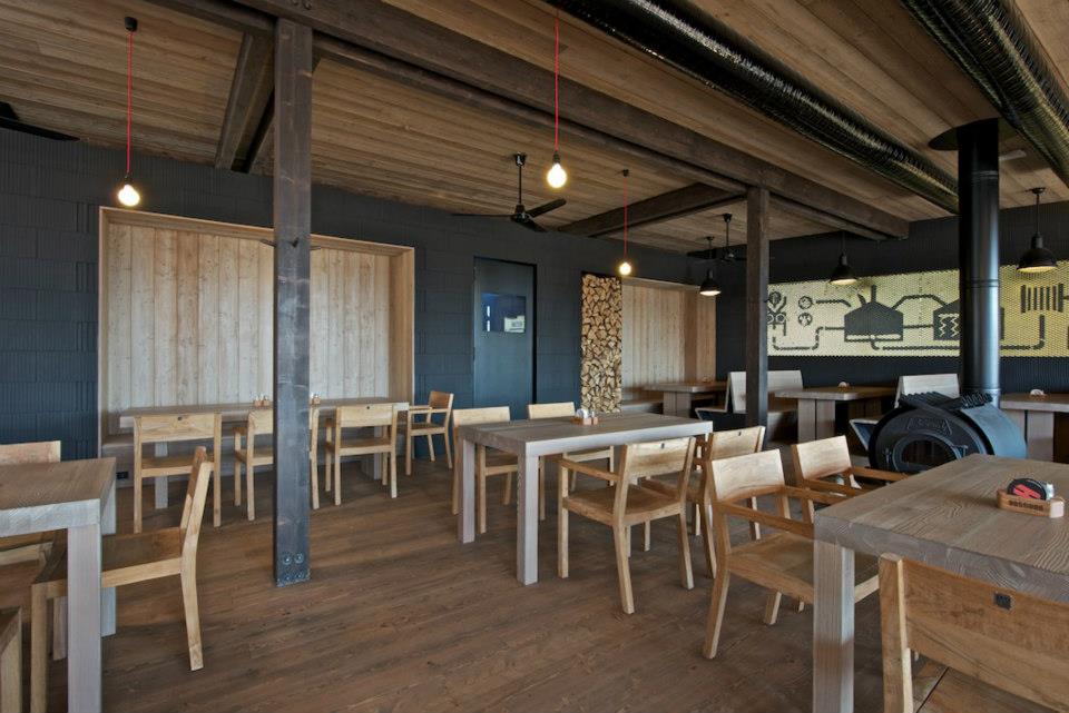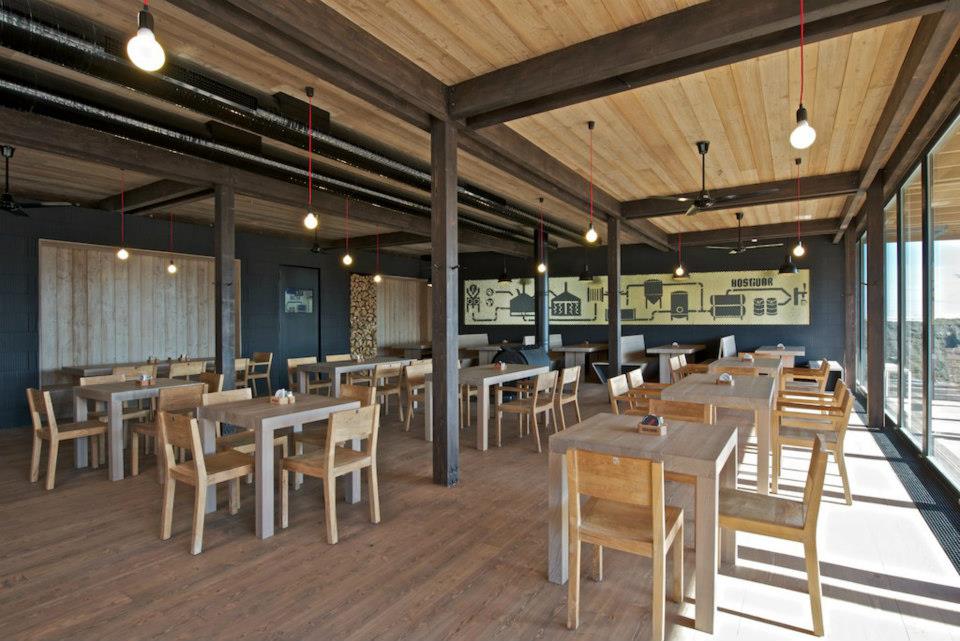 Restaurační část budovy má dřevěnou nosnou konstrukci propsanou do celého interiéru. Zděná konstrukce je tvořena z neomítnutých keramických tvárnic natřených černou barvou. Industriální kamna jsou jednou z mála dekorací v restauraci, která si spíše než na okázalém designu zakládá na kvalitní technologii výroby piva. Prosklená fasáda se otevírá na zastřešenou terasu a přilehlou zahradu.