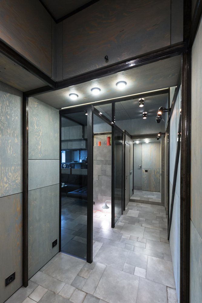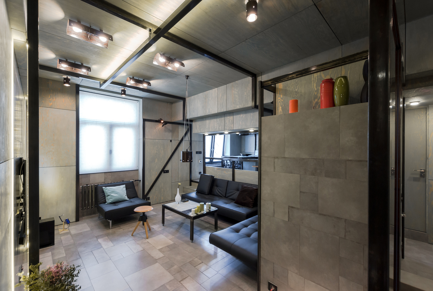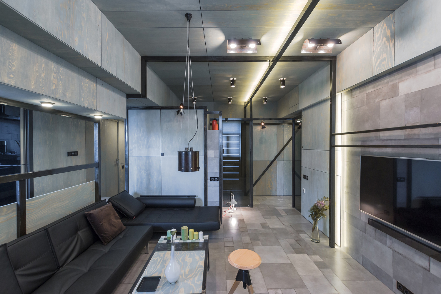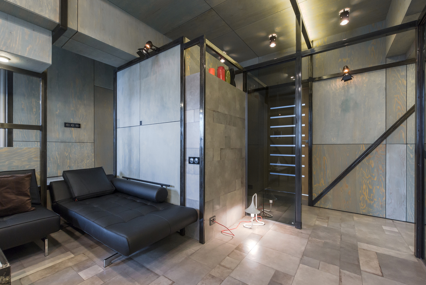 Jednoduchost a jednota interiéru, složeného z předsíně, obývacího pokoje, kuchyně a malé samostatné koupelny, při jehož renovaci byly použity dva základní materiály podbných barev s černým kovovým rámem na vrchu. Kov má jak dekorativní, tak praktické funkce, slouží jako základ pro kuchyňský nábytek, světla a skleněnou stěnu.