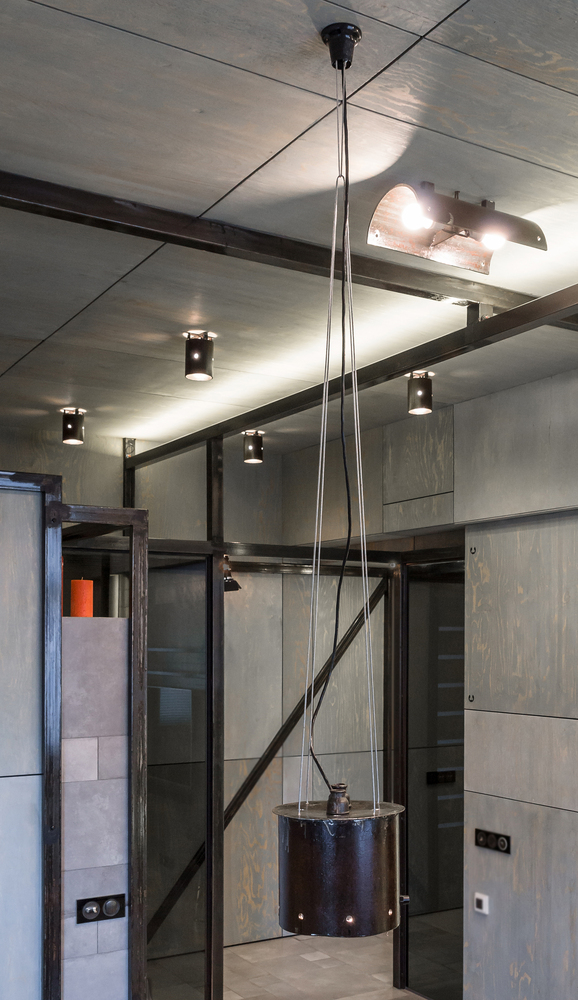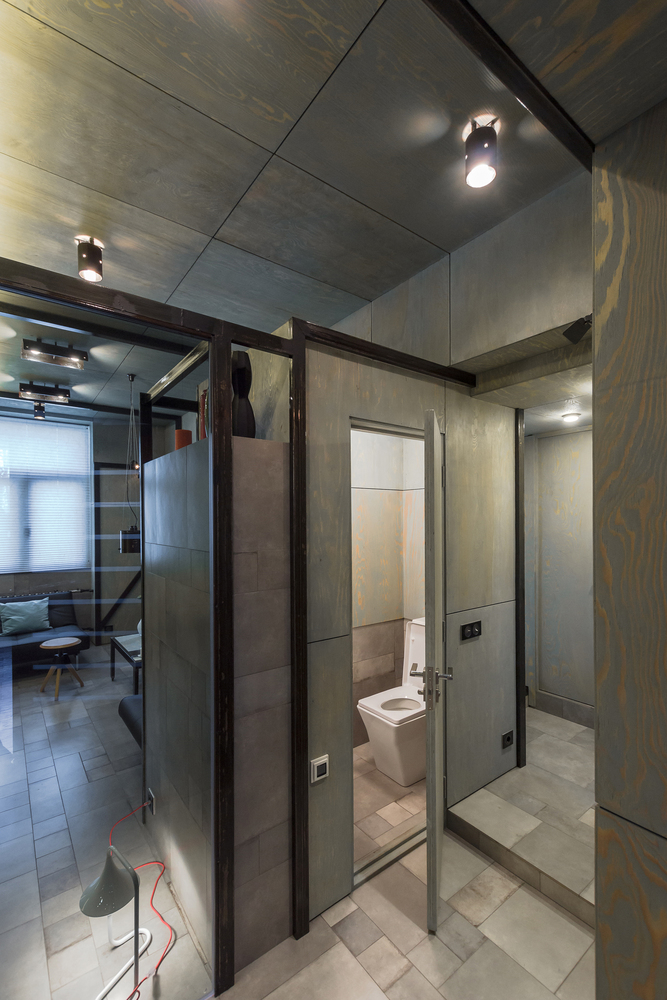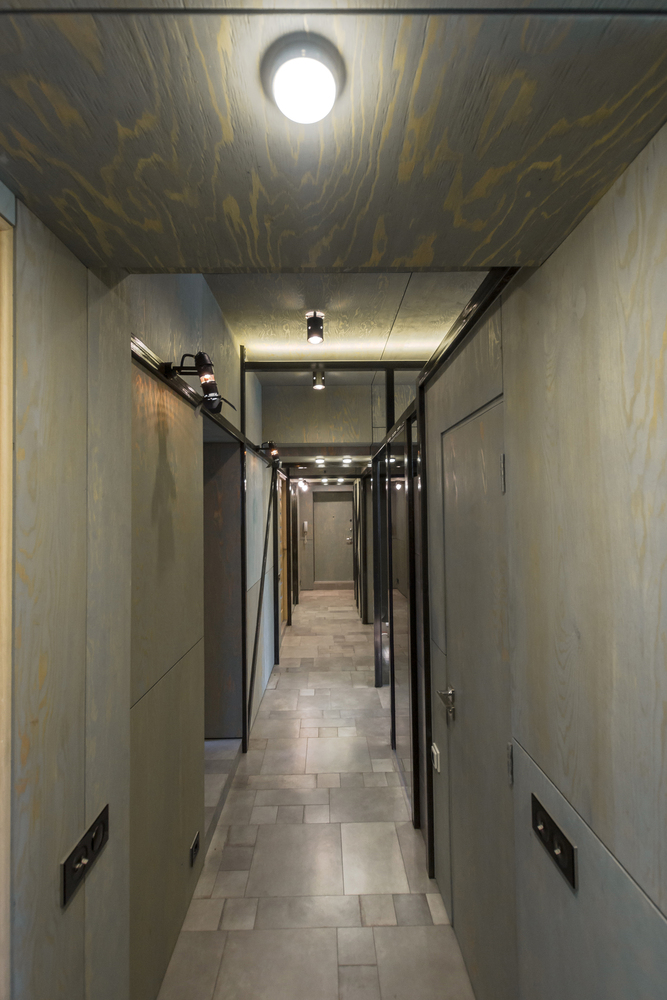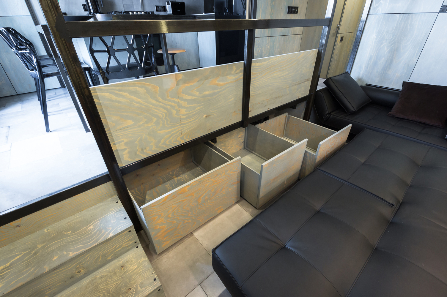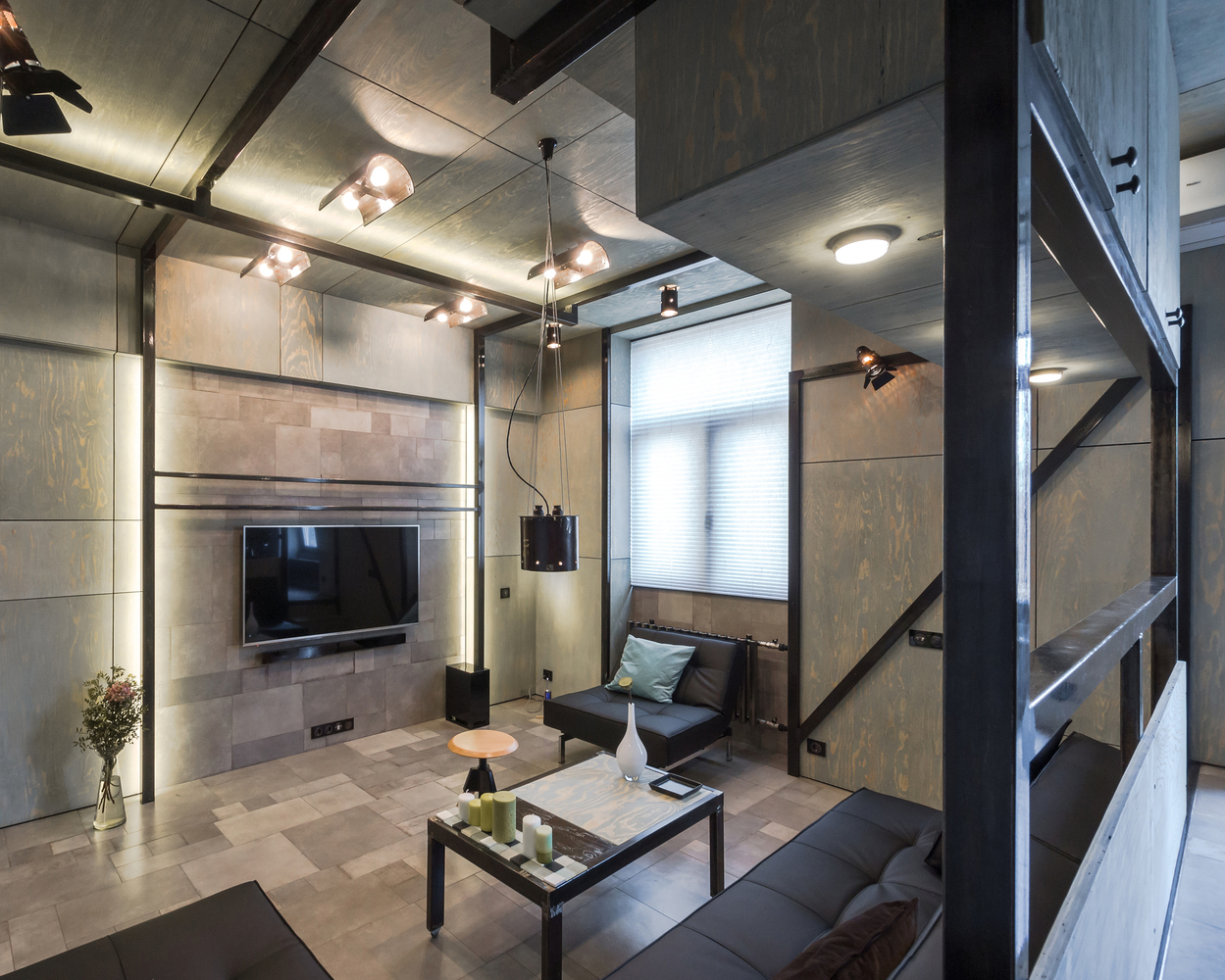 Jednoduchost a jednota interiéru, složeného z předsíně, obývacího pokoje, kuchyně a malé samostatné koupelny, při jehož renovaci byly použity dva základní materiály podbných barev s černým kovovým rámem na vrchu. Kov má jak dekorativní, tak praktické funkce, slouží jako základ pro kuchyňský nábytek, světla a skleněnou stěnu.