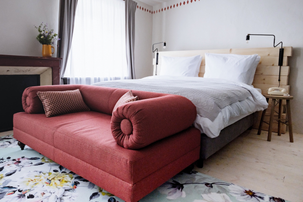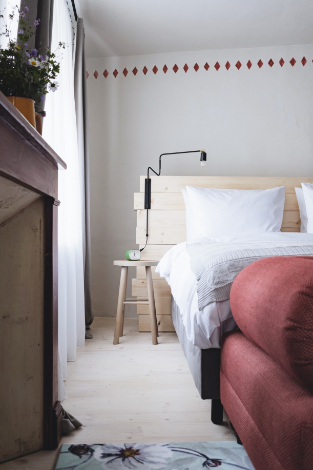 V hotelu Monastery Garden v srdci Českého Krumlova se nachází pokoj Bezinka. V něm najdete nejen dřevěné prvky, které prostor opticky zateplují, ale i krb, který architekti sehnali v antiku. Jde sice o atrapu, i ta však prostor opticky zabydluje. Vytvořili jej ti architekti v čele s architektem Martinem Machů a architektkou Annou Holešovskou.