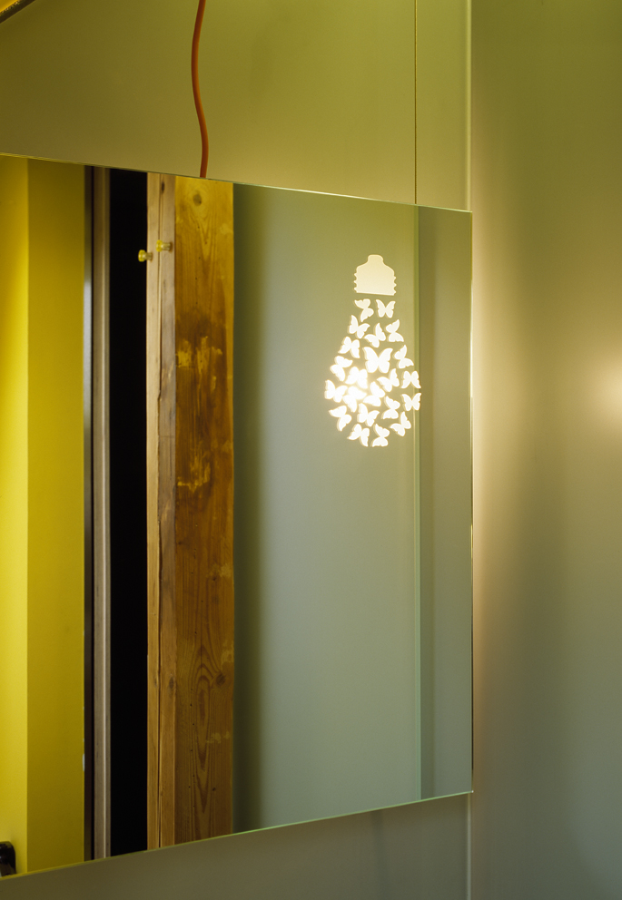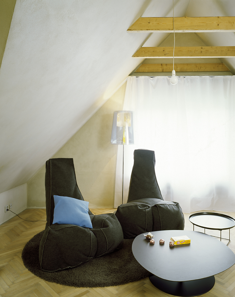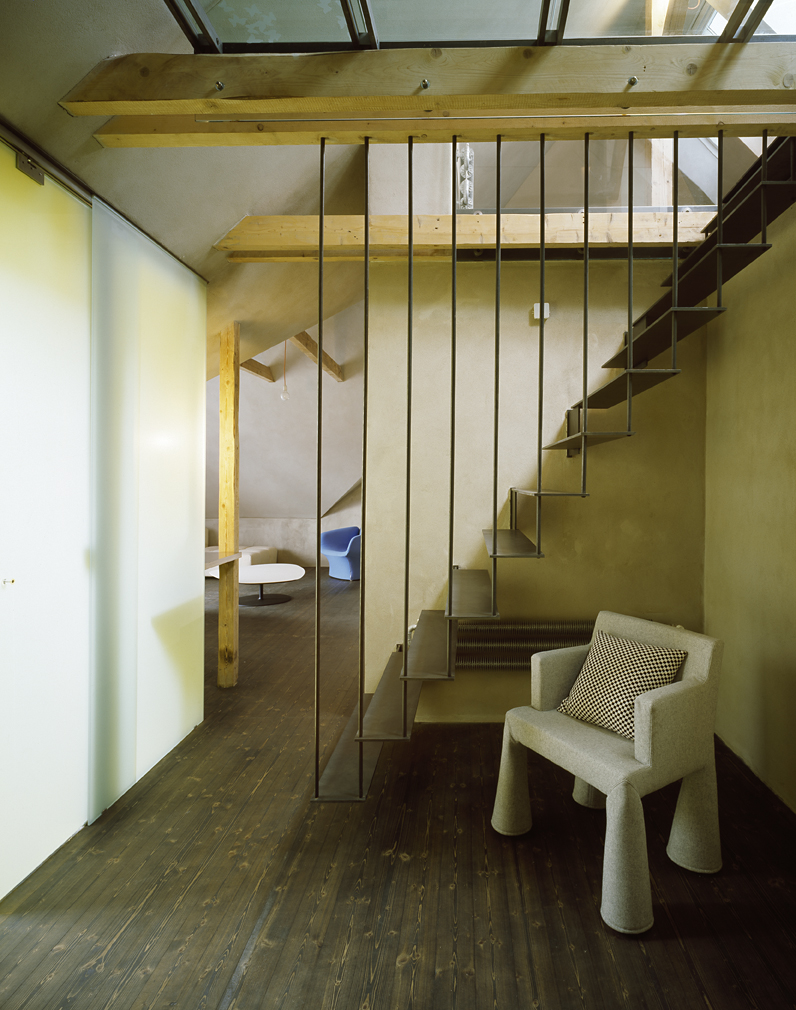 Rekonstrukce podkrovních prostor činžovní vily v Nuslích byla neobvyklá tím, že nešlo o návrh bytů pro konkrétního uživatele a realizaci jeho specifických představ, ale měly svou novou atmosférou oslovit širokou klientelu budoucích nájemců. Společným drobným symbolem interiéru jsou hejna motýlů, která se ve formě grafiky rozlétla na čirých sklech podlahy i příček.