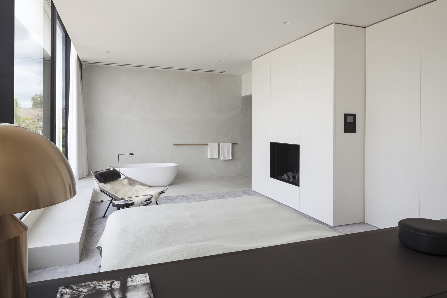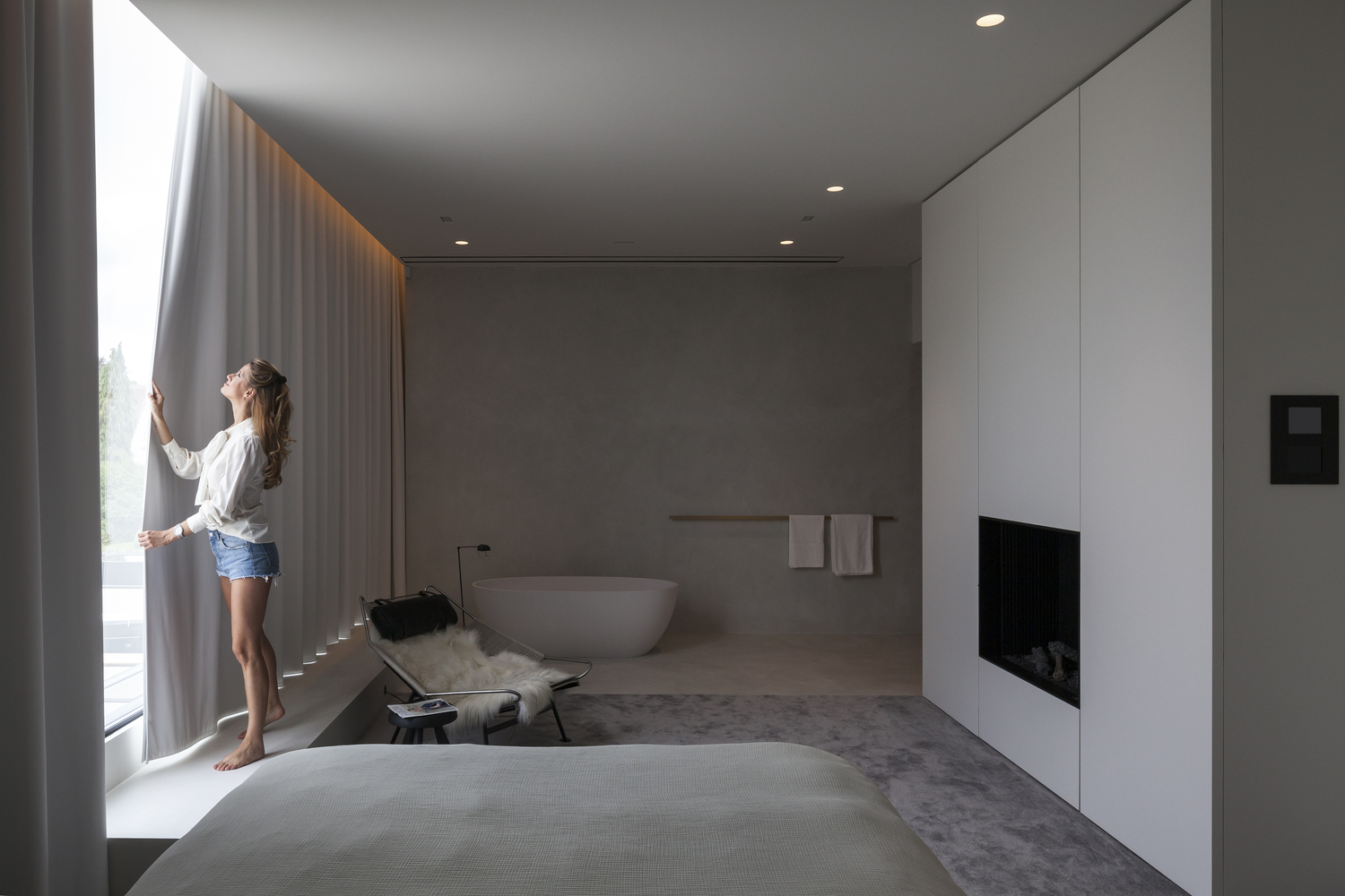 Nadčasová ložnice rezidence VDB, která se nachází v prvním patře a poskytuje výhled na okolní golfové hřiště. Ložnici dominuje i oválná vana.