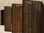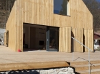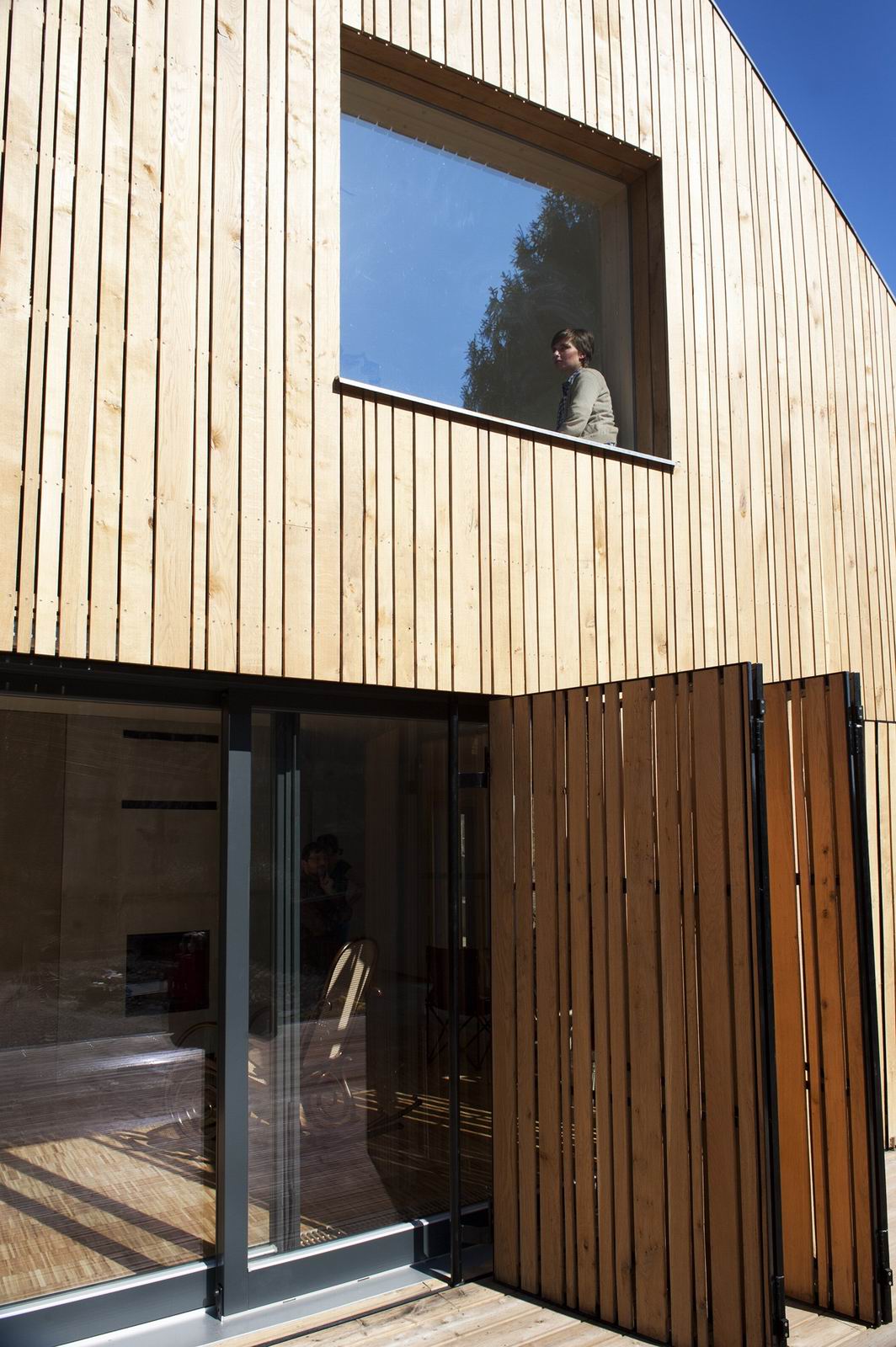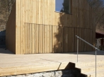 Na místě čtvercové chaty je navržen nový obdélný dům. Zúžení oproti původní stavbě uvolnilo prostor podél delších stran. Tak mohla vzniknout dřevěné paluba, která plynule navazuje na obytné přízemí. Na jihu před domem rozšiřuje hlavní obytný prostor propojený s exteriérem prosklenou posuvnou stěnou přes celou šířku domu. Široké schodiště terasy skrývá tekoucí potok.