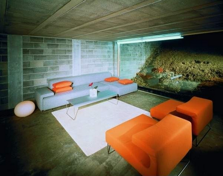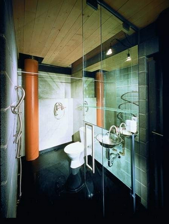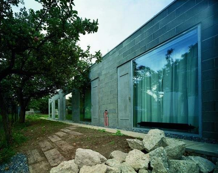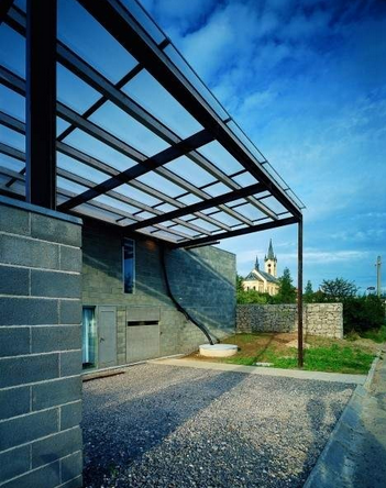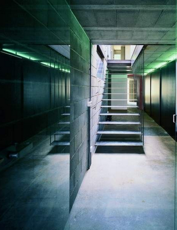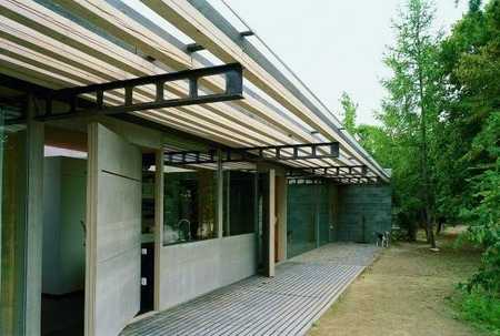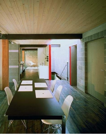 Hlavní komunikační osou domu je hala, lemována po celé své pravé straně mělkými komorami za posuvnými dřevěnými dveřmi a po levé straně střední nosnou zdí z pohledového zdiva, podél stoupá schodiště do prvního patra na úroveň hlavního obytného prostoru, od zahrady odděleného velkoplošně prosklenou stěnou.