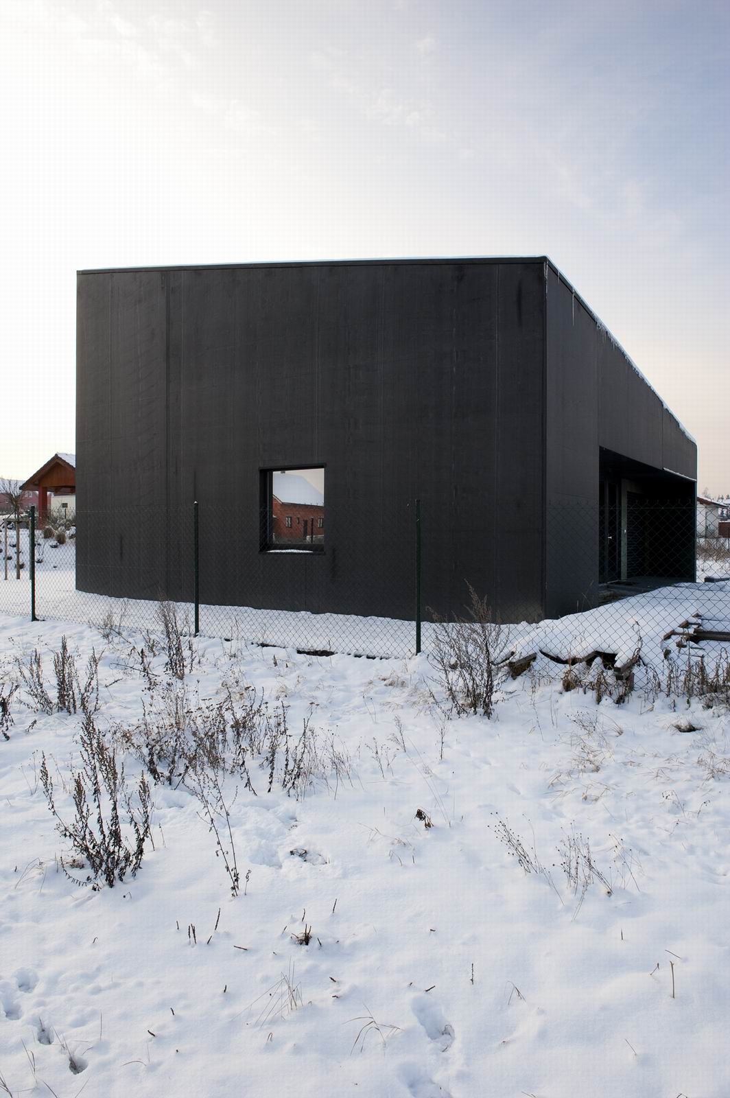 Kompaktní hmota domu je definovaná tvary šikmých střech s různými sklony. Rozděluje lichoběžníkový pozemek na vstupní předzahrádku a hlavní zahradu. Tvar domu se záměrně otevírá k jižnímu nároží za sluncem, k severu se uzavírá. Jihozápadní fasáda domu s okny do obytných místností je chráněna slunolamem z modřínových hranolů. Ostatní fasády včetně střechy jsou provedeny z EPDM fólie.