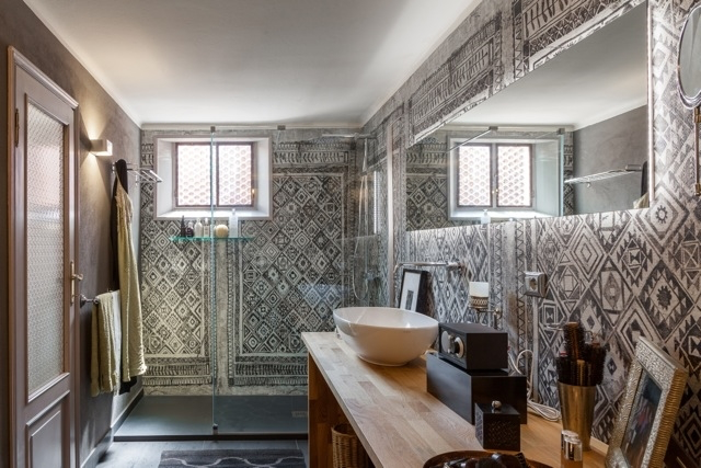 Elegantní koupelna s dekorativním přechodem mezi stěnami a sprchovým koutem: celoplošný vzor kombinující bílou a černou. Hra s optickou iluzí.