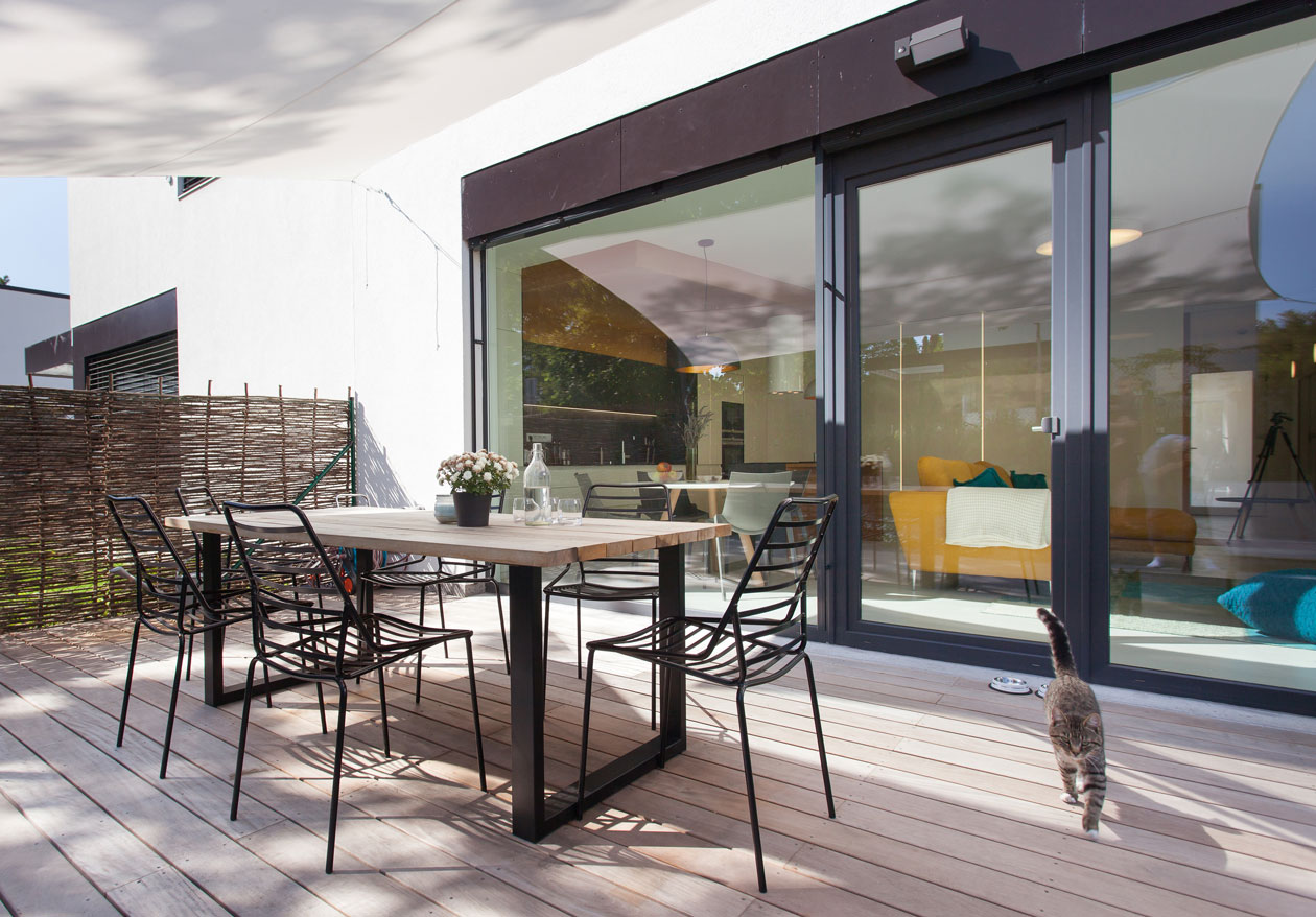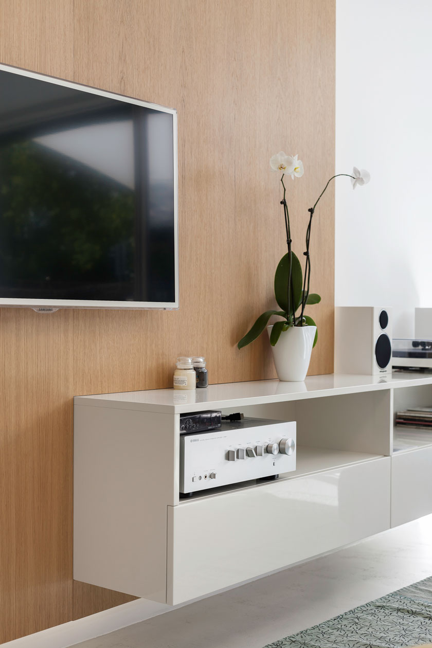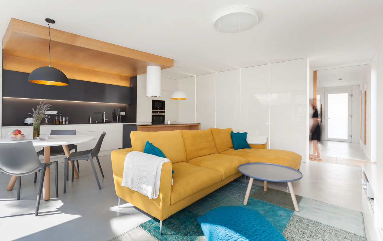 Strohá geometrie a bílá barva v kombinaci s přírodním olejovaným dubem a antracitově šedými plochami jako podklad pro barevné hrátky v prostoru. Zahrada jako nekonečně se měnící obraz. Interier pro mladý pár, kterému záleží na každém detailu. Vytvořili jsme jakousi neutrální kulisu, kterou lze téměř libovolně doplňovat prvky dle vkusu majitelů.