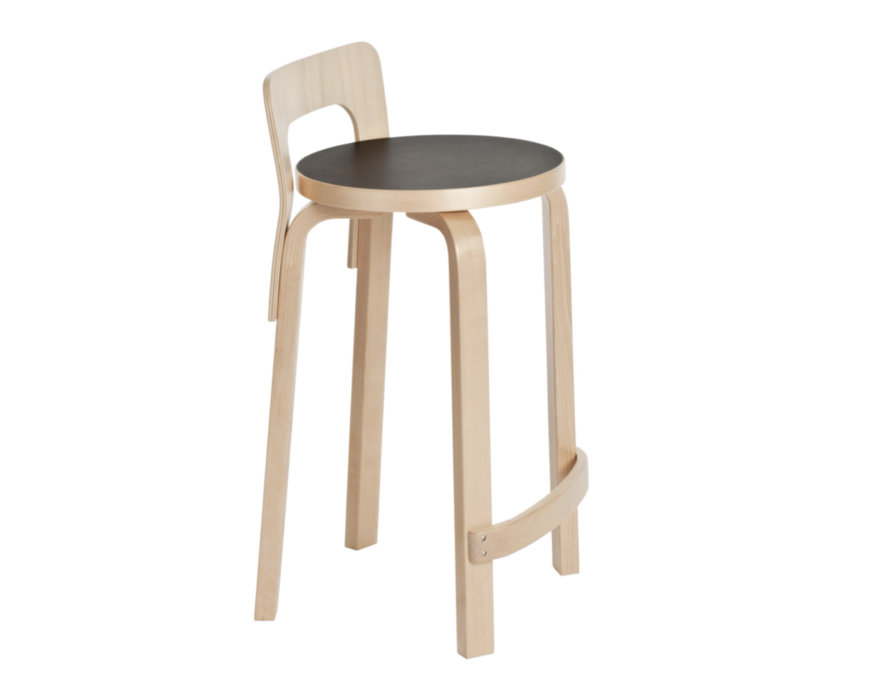 Vysoká židle Alvar Aalto s dlouhými nohami K65 je optimální výškou pro vysoké stoly a barové pulty. Nízké opěradlo nabízí pohodlí a zakřivená kolejnice slouží jako dokonalá opěrka nohou.