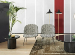 Beetle Lounge Chair od dánské značky GUBI. Čalounění v kombinaci s koženým orámováním a černým podnožím jasně dokazuje odkud vzala židle své jméno.