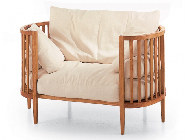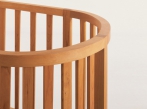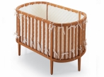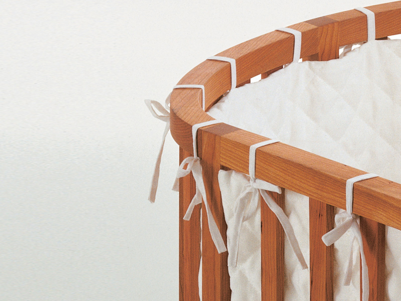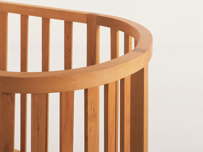 Tato malá postýlka se vyznačuje měkkými křivkami a pravidelností vertikálních řezů. S jedním malým pohybem lze postýlku proměnit na pohovku s mnoha malými polštáři, na kterých si děti mohou pohodlně hrát. Na vyžádání lze postýlku vybavit textilními doplňky, včetně matrace, které jsou vyrobeny z neošetřené anti-alergické textilie. Přilnavé látky na stěnách neobsahují žádné škodlivé chemikálie.