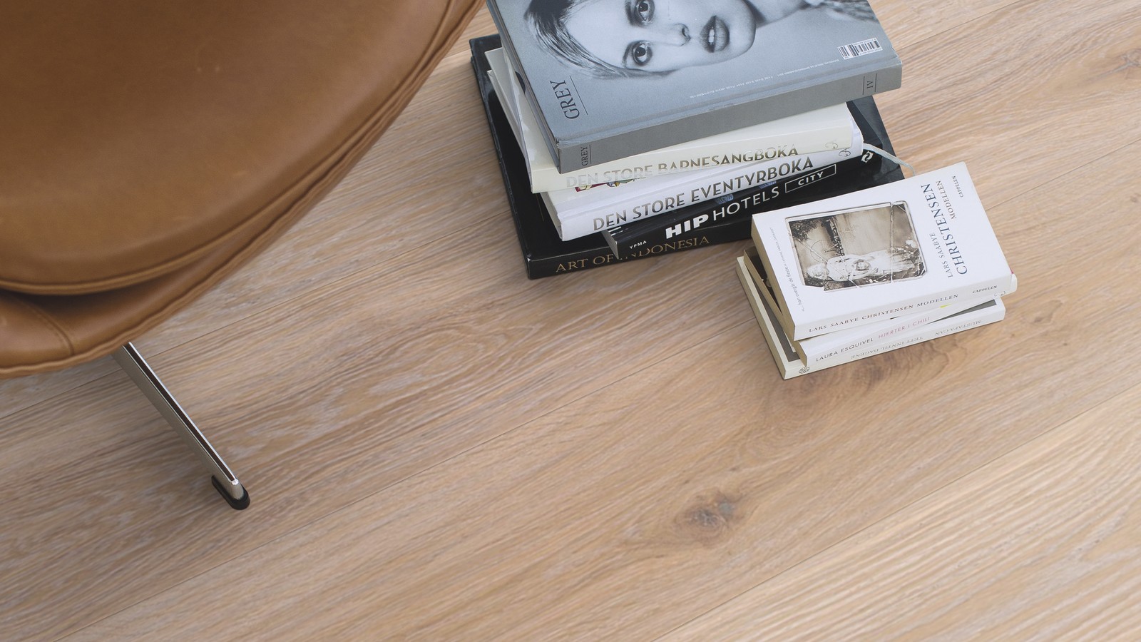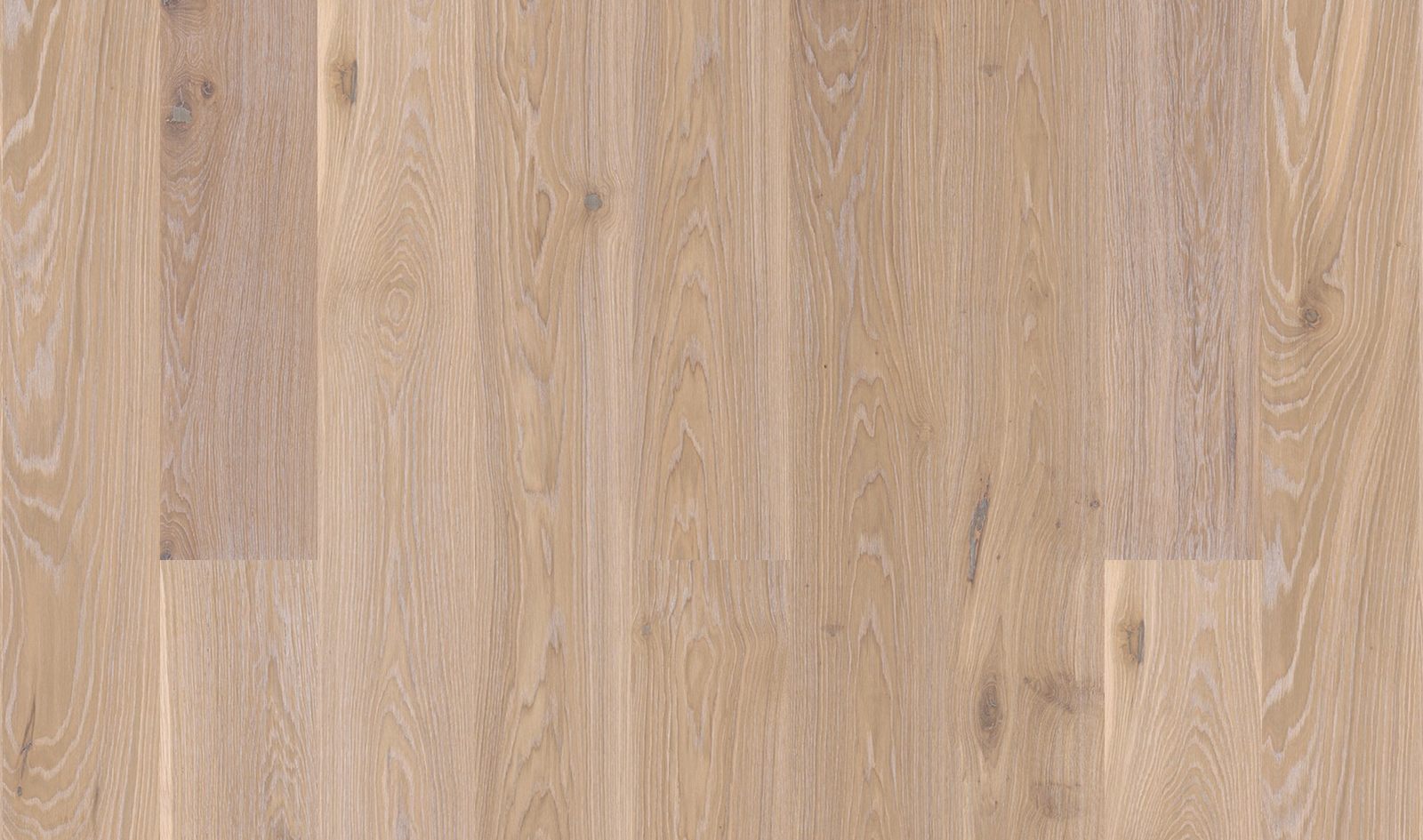 Dubové prkno šíře 209 mm je bělené, kartáčované a upravené bíle pigmentovaným olejem.