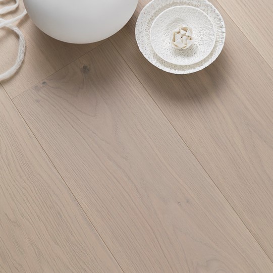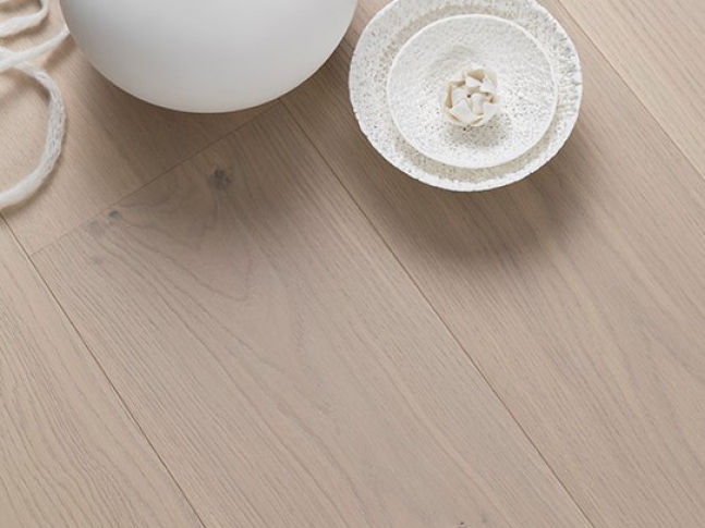 Jedná se o dřevěnou podlahu norského výrobce BOEN v provedení dubového běleného prkna šíře 209 mm, Castle, dekor Warm Cotton, broušený povrch, ručně kartáčovaný, mořeno do bílo-béžového odstínu, povrchová úprava zátěžový lak Live Pure.