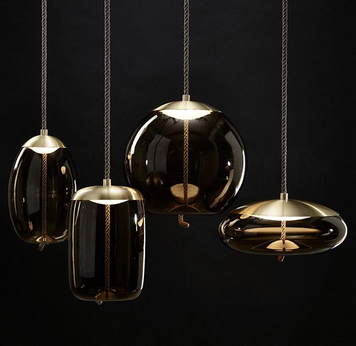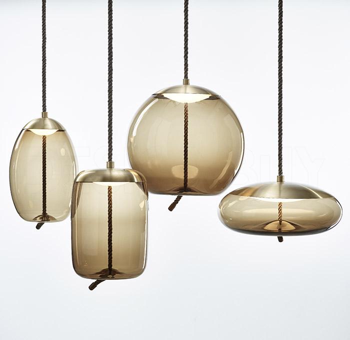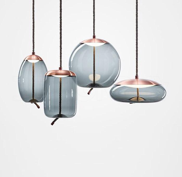 kolekce závěsných svítidel, které kombinuje napřímené režné lano a oblé tvary foukaného skla.
