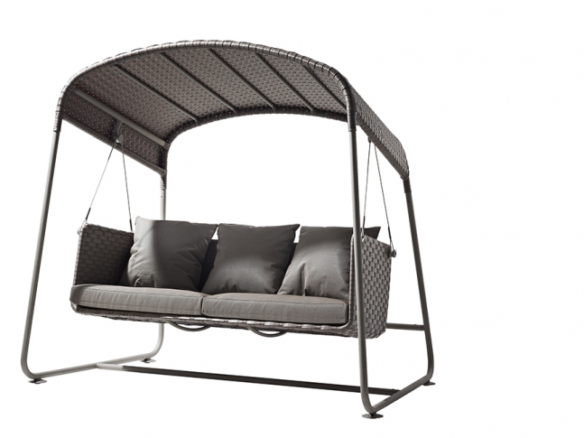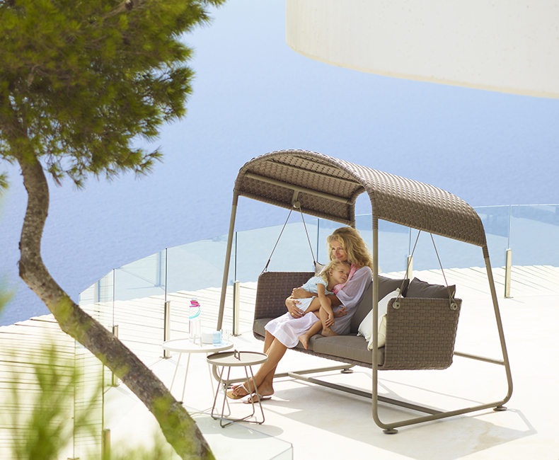 Houpačka Cave, od dánské společnosti Cane-Line, je vhodná pro vnější účely. Je vybavena stříškou, jejíž speciální tkaní umožňuje snadné čistění. Doplněna je textilními polštáři, které lze pomocí speciálního popruhu zafixovat, aby nedošlo k uvolnění. Jsou voděodolné, proto není nutné je před nepříznivým počasím uklízet.