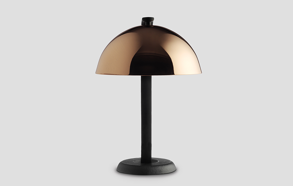 Stolní lampa Cloche poskytuje směrové světlo. Jeho černě lakované rameno, zahnuté do tvaru s, vytváří vizuální nerovnováhu s litinovým podstavcem. Připomíná tradiční jídelní osvětlení zvonovitého klobouku nazývající se "cloche". K dispozici jsou 3 barevná provedení: matná bílá, matná černá, leštěná měď. Kolekce: Wrong for Hay. Výrobce: Hay.