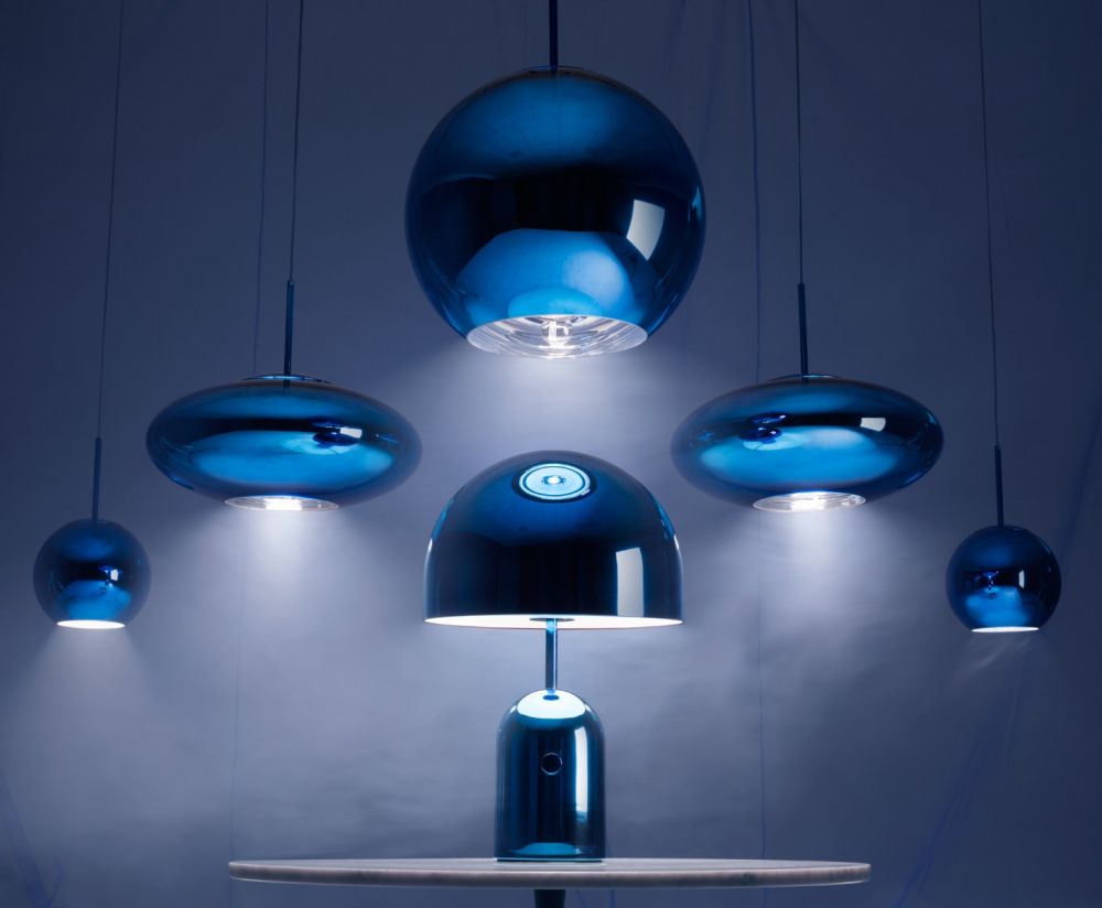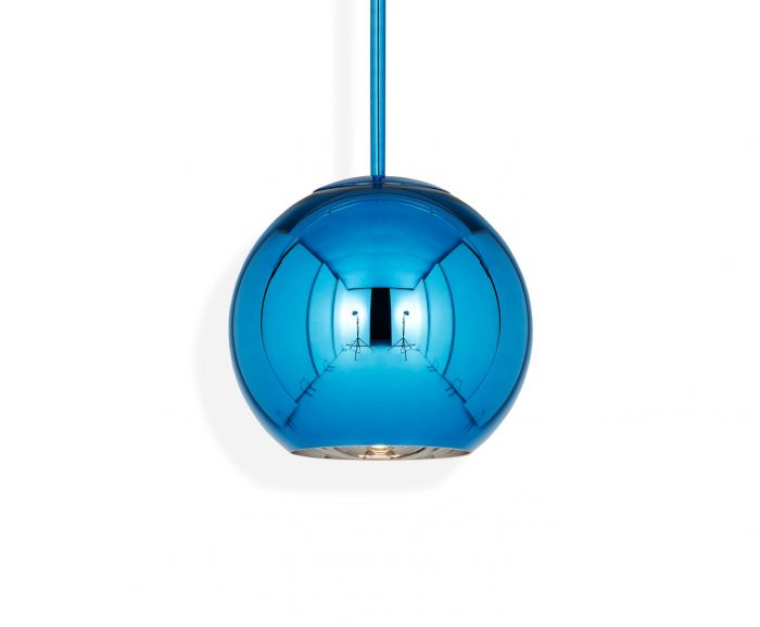Modrá monochromatická lesklá koule s nenápadným hliníkovým vnitřkem. Světlo je dostupné ve dvou průměrech; 25 a 45 cm.